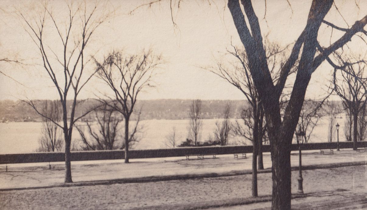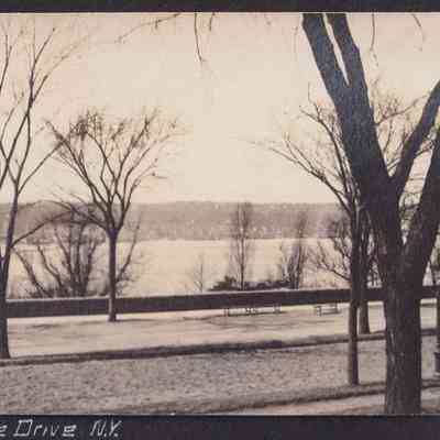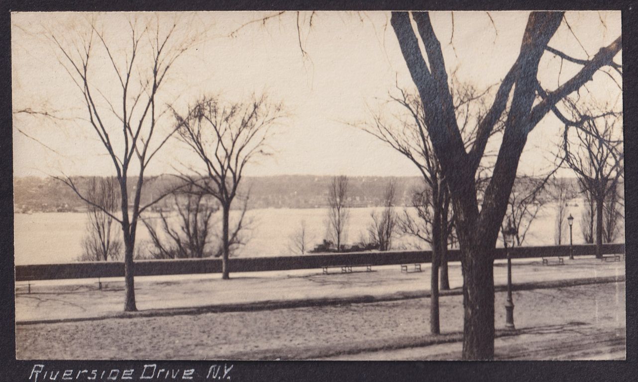 Black-and-white photograph of Riverside Drive with Lake Flower in the background. There are trees, grass, street lights, benches, and a fence between the photographer and Lake Flower. "Riverside Drive, N.Y." is written in white ink beneath the photograph.