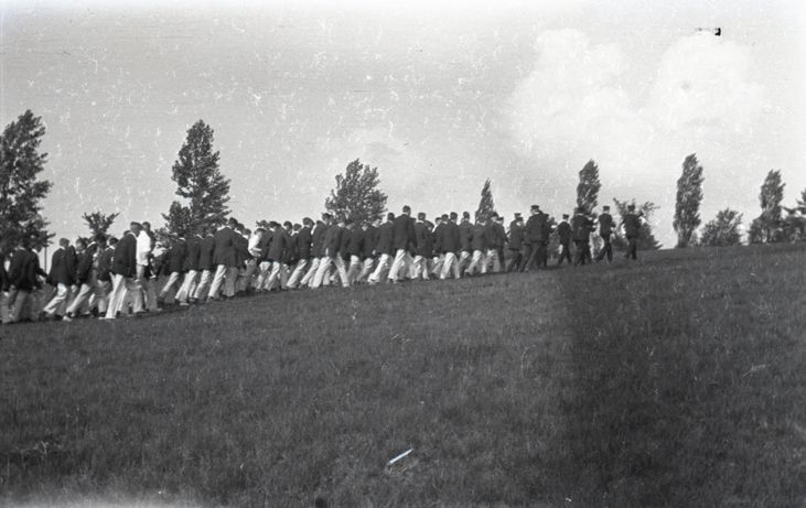 Negative of a large group of young men, all wearing light pants and dark jackets, walking in lines up a hill. There is a band at the front of the line. Most likely taken by Mary Ives Baldwin. This item is not fully cataloged but has been uploaded so the image is publicly available; if you would like us to prioritize cataloging this item, please contact the HSL Collections team.