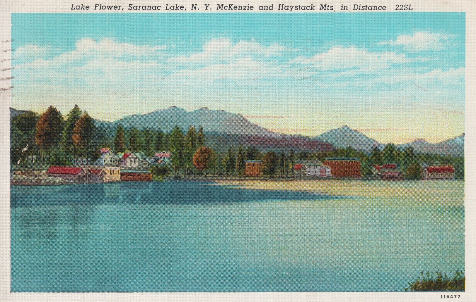Color postcard showing the view east across Lake Flower. Buildings are visible on the far side of the lake. Printed caption on front reads, "Lake Flower, Saranac Lake, N. Y. McKensize and Haystack Mts. in Distance." Printed by C. W. Hughes & Co., Inc., Mechanicville, NY. Used, divided back, white border, linen texture, postmarked Saranac Lake, November 26, 1940.
