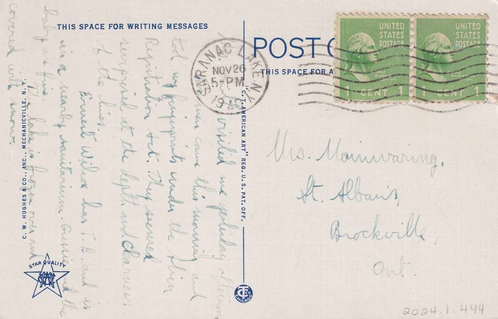 Handwritten message on reverse reads, "Mr. Smith [?] visited me yesterday afternoon, two men came this morning and took my fingerprints under the Alien Registration Act. They seemed surprised at the depth and clearness of the lines. Ernest Wilcox has T. B. and is in a nearby sanitarium. Gussie and the baby are fine. The lake is frozen over and covered with snow." Mailed to Mrs. Mainwaring, St. Albans, Brockville, Ont.Subject Place