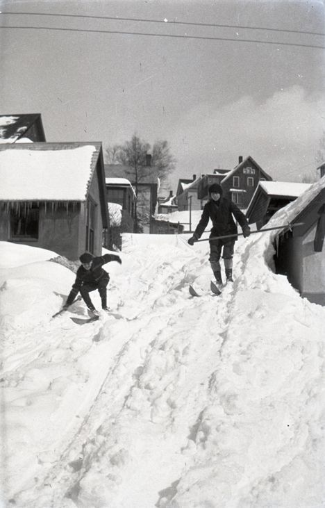 Negative of two people on skis in the backyard of the Baldwin House. The one on the right is Henry Ives Baldwin and the one on the left might be Dr. Edward R. Baldwin. Most likely taken by Mary Ives Baldwin. This item is not fully cataloged but has been uploaded so the image is publicly available; if you would like us to prioritize cataloging this item, please contact the HSL Collections team.