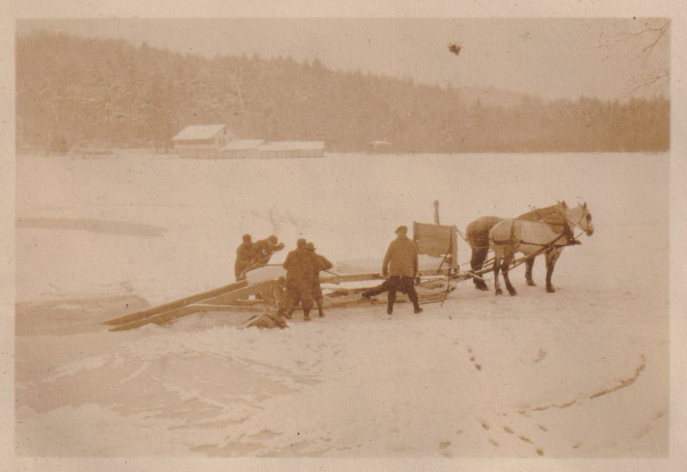 Black-and-White photograph of workers loading ice blocks on a horse-drawn sled on Ampersand Bay. Part of album 2024.21.1, kept by Amy Jones and David Blair Jones c. 1930-1934.