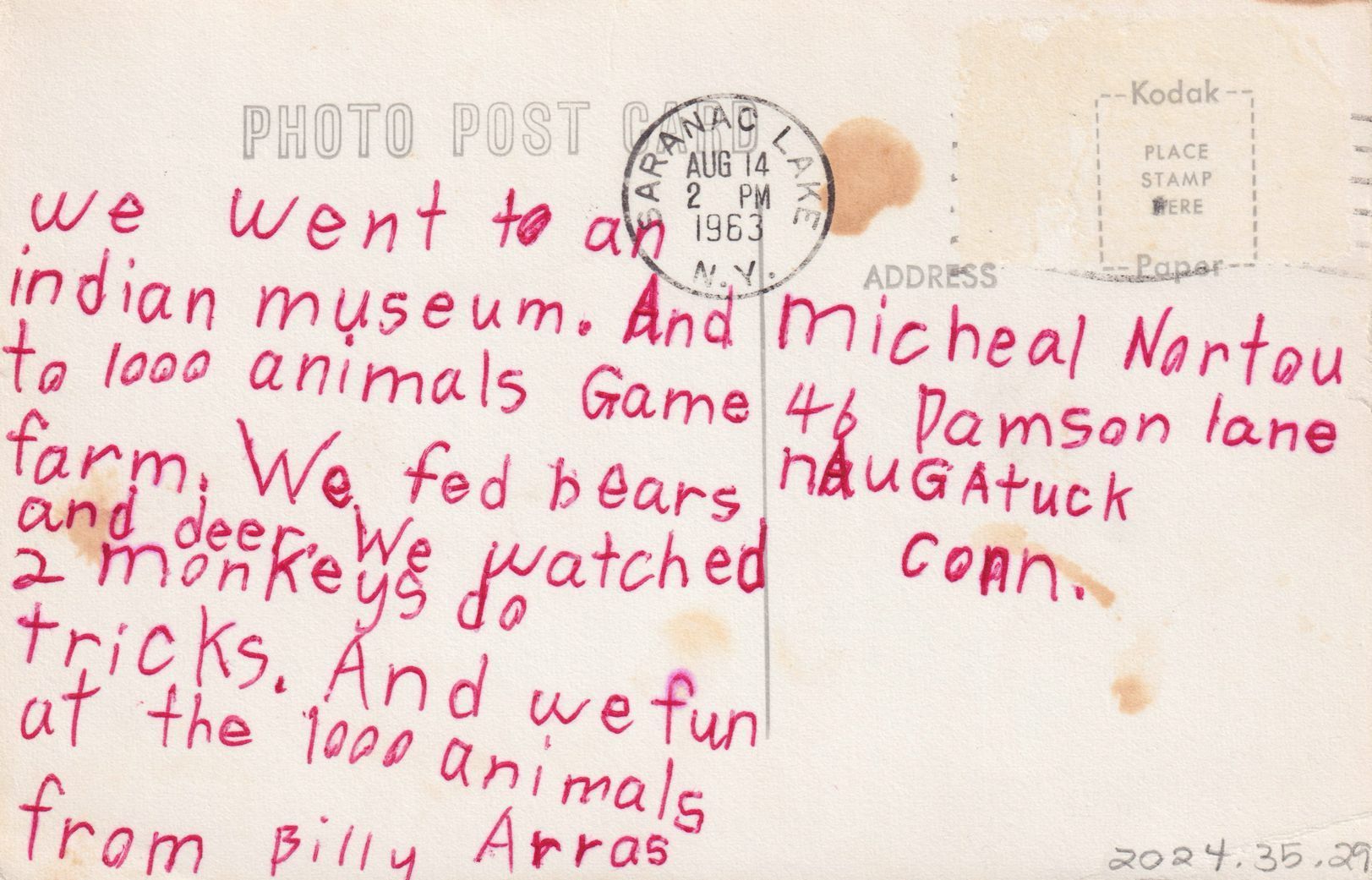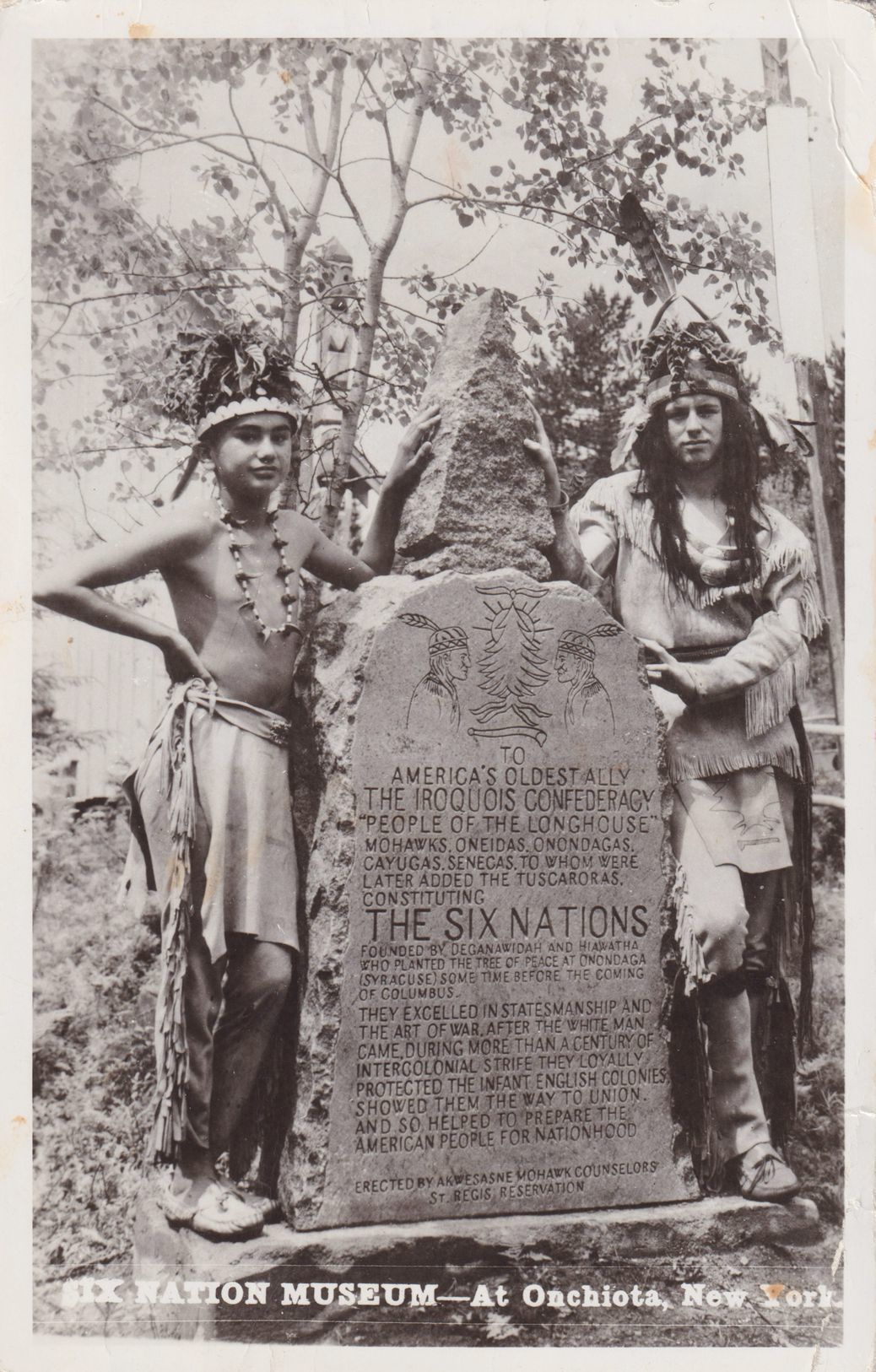Black-and-White photograph postcard showing two young men in Native American ceremonial dress. They are leaning against a stone memorial tablet honoring the Six Nations. Printed caption on front reads, "Six Nation [sic] Museum--At Onchiota, New York." No photographer's mark. Used, divided back, white border, postmarked Saranac Lake, August 14, 1963. Handwritten note on back reads, "We went to an Indian museum. And to 1000 animals game farm. We fed bears and deer. We watched 2 monkeys do tricks. And we fun at the 1000 Animals. From Billy Arras." Mailed to Michael Nartou, 46 Damson Lane, Naugatuck, CT.Subject Place