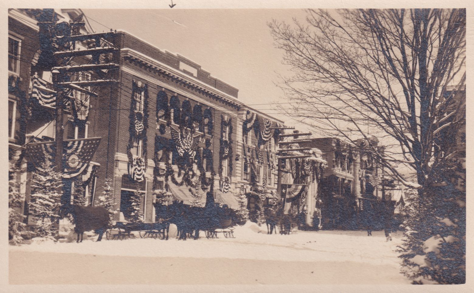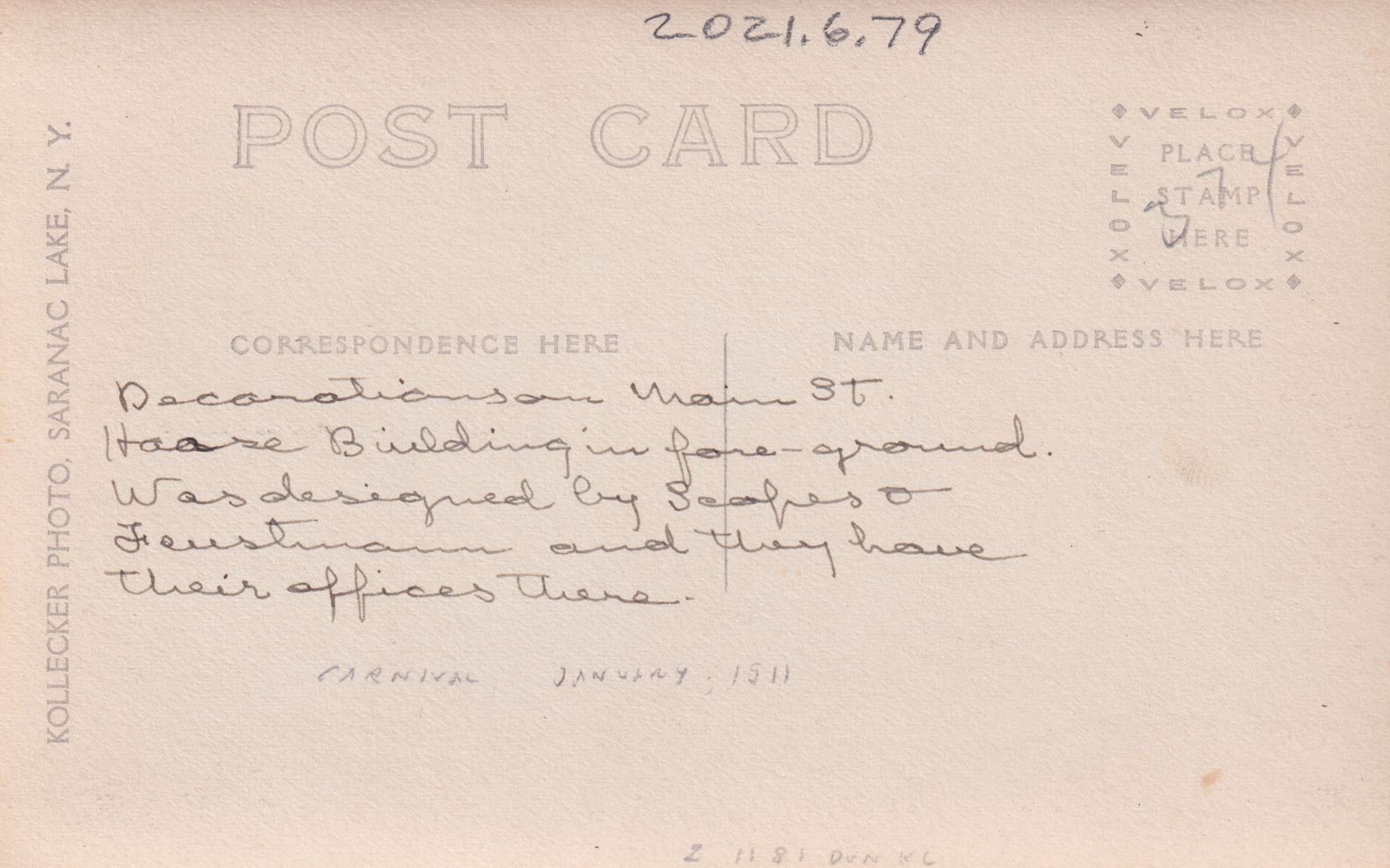 Black and white photo postcard of the view on Main Street, decorated for Winter Carnival. Handwritten on the reverse is "Decorations on Main St. Haase Building in foreground, was designed by Scopes and Feustmann and they have their offices there," and "Carnival January 1911." The side of the back has "Kollecker Photo, Saranac Lake, N. Y." printed on it.