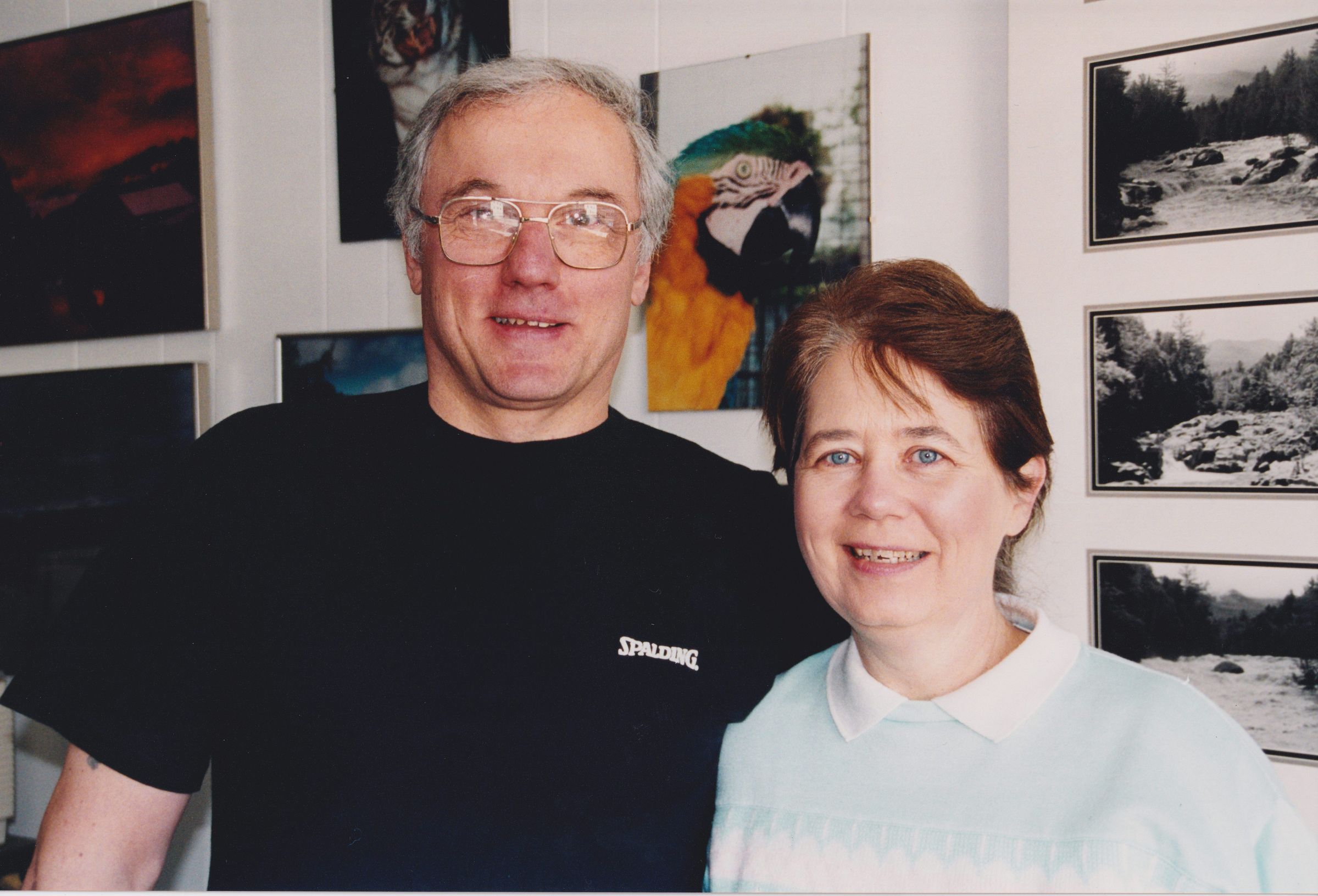Color photograph of Mike and Gayle Vascukynas in front of a wall of photographic prints inside of their business, SnapShot Photo. Portrait taken by Mary Lou Hanpeter Banks as part of her Soul Proprietor exhibition.