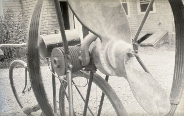 Negative of a medium-sized propeller with a small motor attached to the back of a bicycle. Most likely taken by Mary Ives Baldwin. This item is not fully cataloged but has been uploaded so the image is publicly available; if you would like us to prioritize cataloging this item, please contact the HSL Collections team.