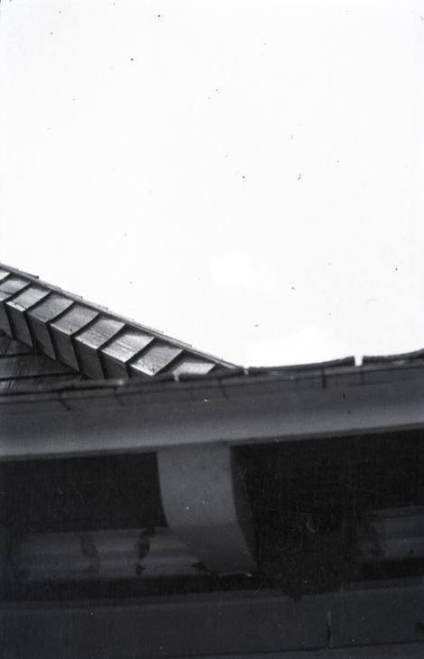 Negative of a gutter on the side of a house and the edge of the roof. Most likely taken by Mary Ives Baldwin. This item is not fully cataloged but has been uploaded so the image is publicly available; if you would like us to prioritize cataloging this item, please contact the HSL Collections team.