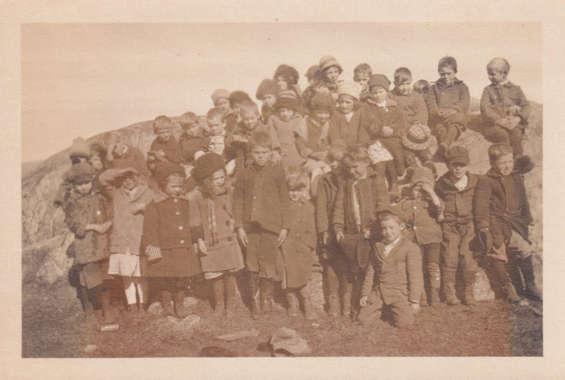 Black-and-White photograph of a large group of children outdoors. They are all seated on or leaning against a large boulder. The photograph was likely printed by Kollecker's Kodak and Gift Shop.