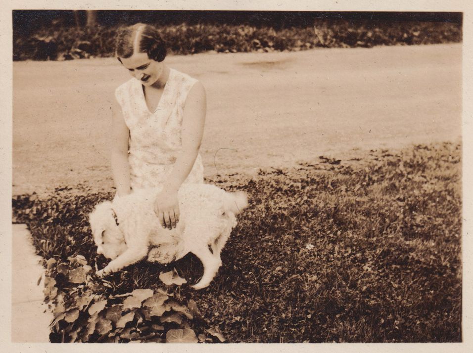 Black-and-White photograph of Peggy, the Jones Family's dog, with an unidentified woman. They are sitting outdoors in the grass. Part of album 2024.21.1, kept by Amy Jones and David Blair Jones c. 1930-1934.