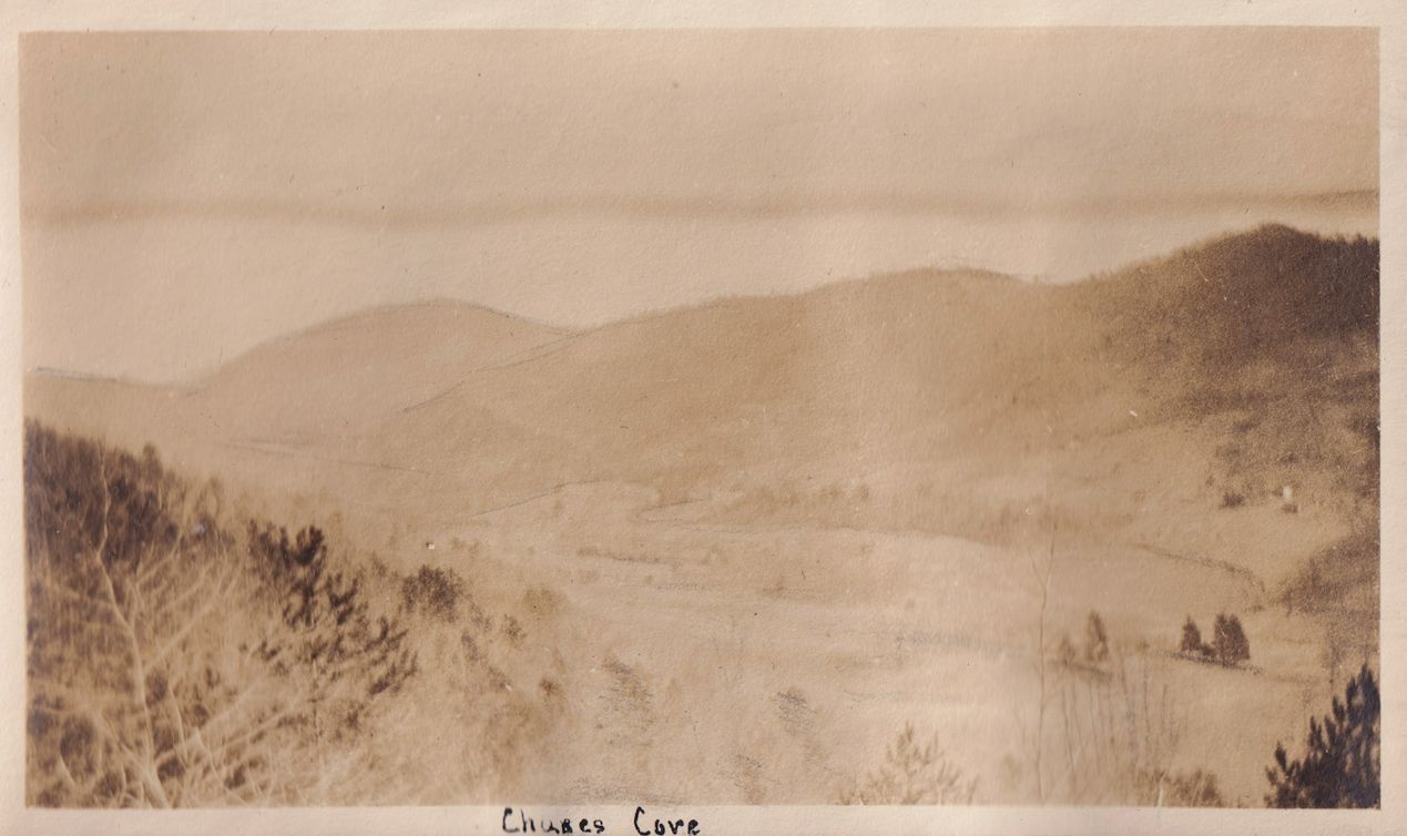 Black-and-white photograph of Chunns Cove in Asheville, North Carolina. There is a valley between multiple mountains or large hills. "Chunes Cove" is written in ink beneath the photograph.