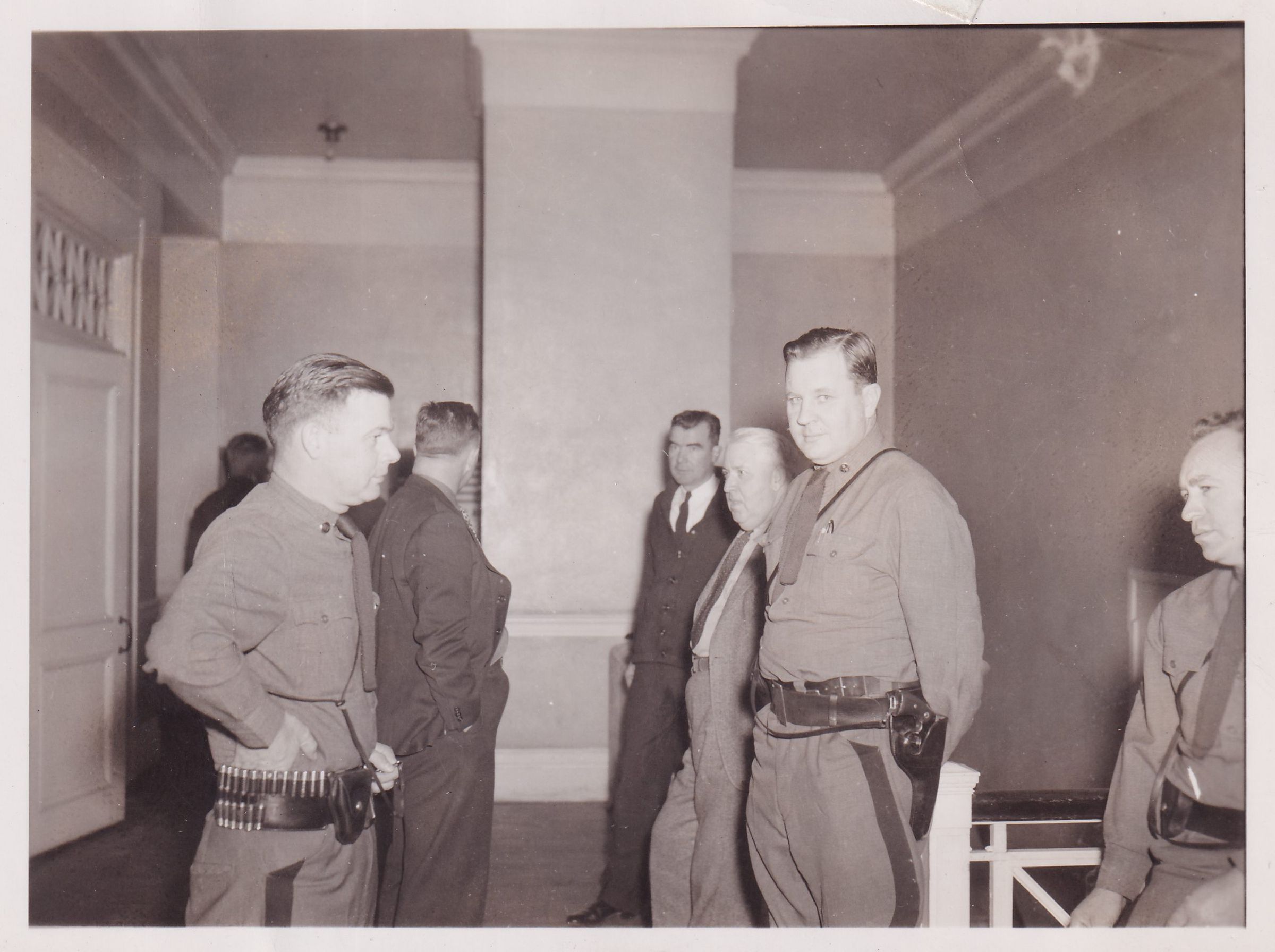 Black-and-White photograph of a group of men standing in a hallway. Many of them are dressed in game warden uniforms. Ray Burmaster is standing at center. This is the same photograph as 2022.144.133.