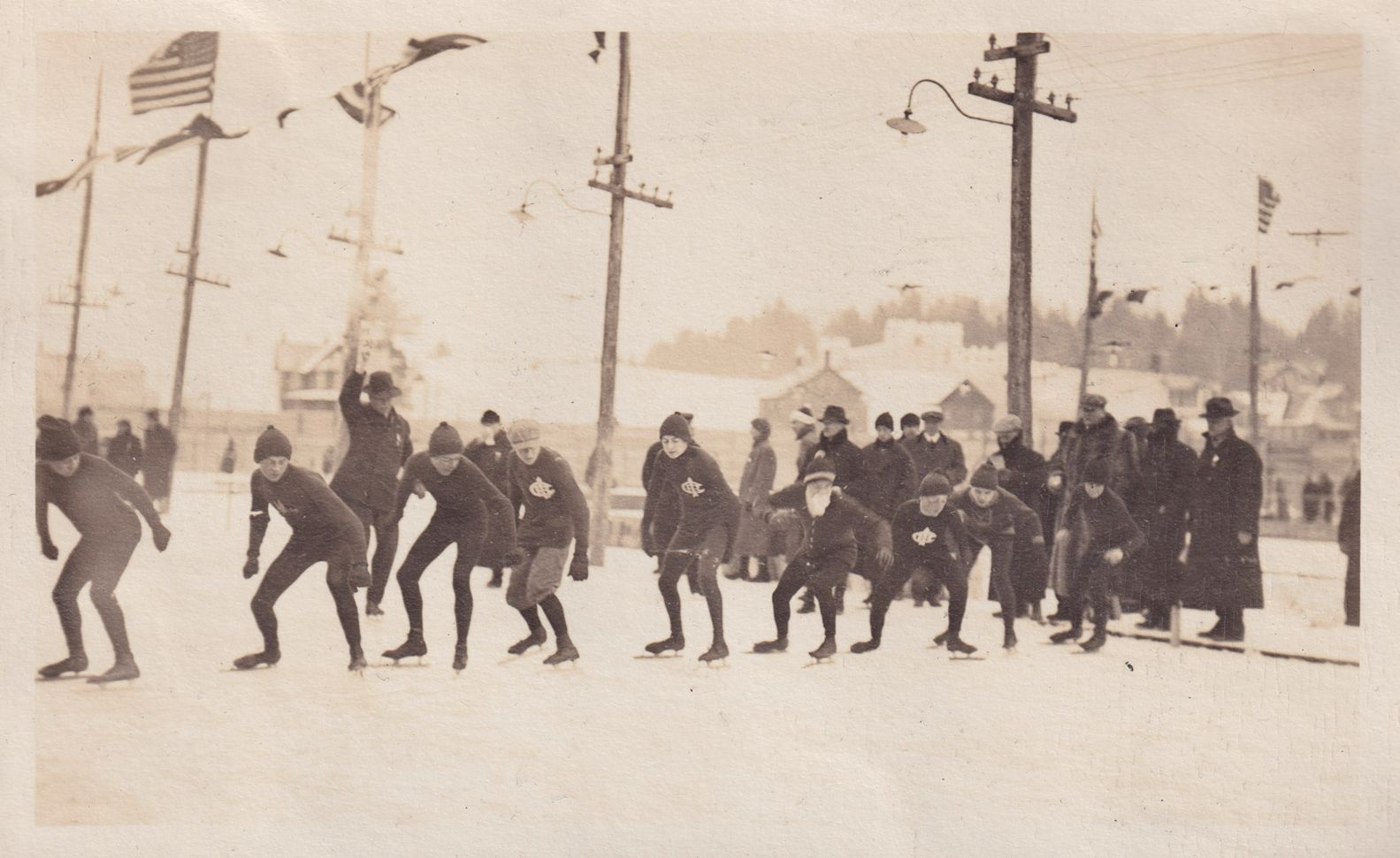 Black-and-white photograph of a group of young male skaters at the start line of a race. There is a man behind them, pointing a gun into the air. They are at a rink on Pontiac Bay, Lake Flower.