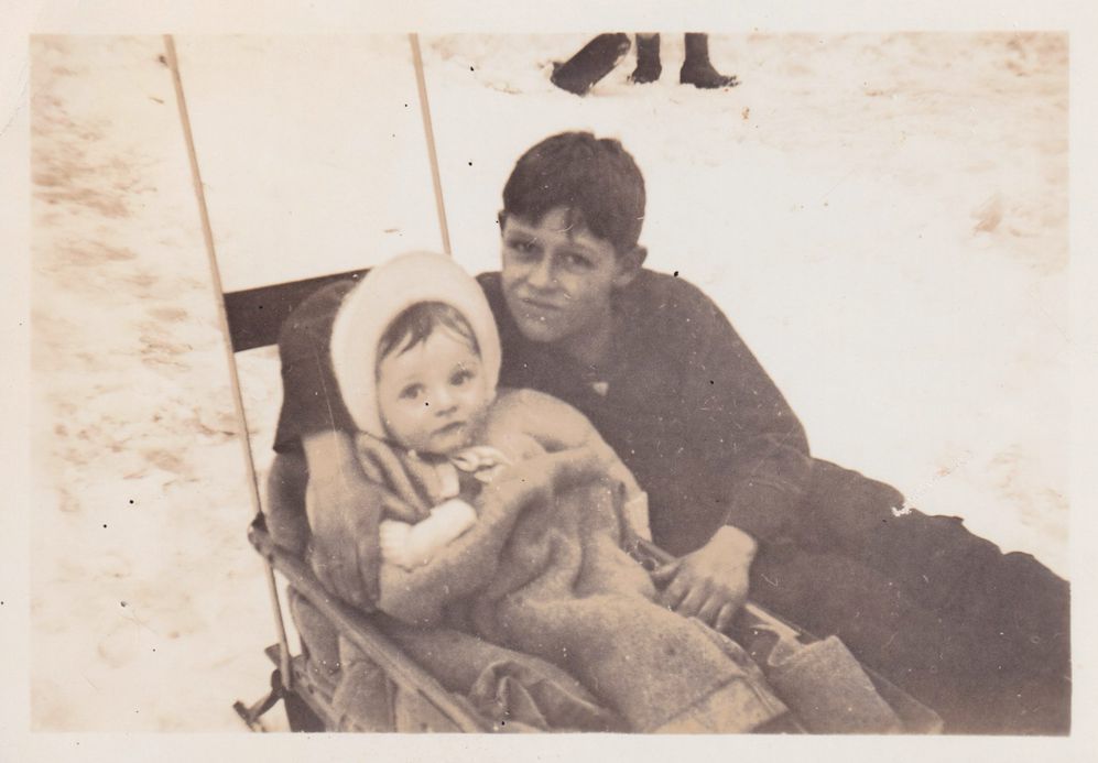 Black-and-White photograph of two children in the snow. One is seated in a sled, and the other has his arms around them. The photograph was likely printed by Kollecker's Kodak and Gift Shop.