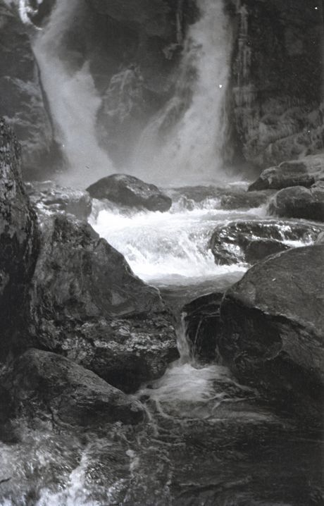 Negative of the water from a waterfall flowing over rocks and into rapids. Most likely taken by Mary Ives Baldwin. This item is not fully cataloged but has been uploaded so the image is publicly available; if you would like us to prioritize cataloging this item, please contact the HSL Collections team.