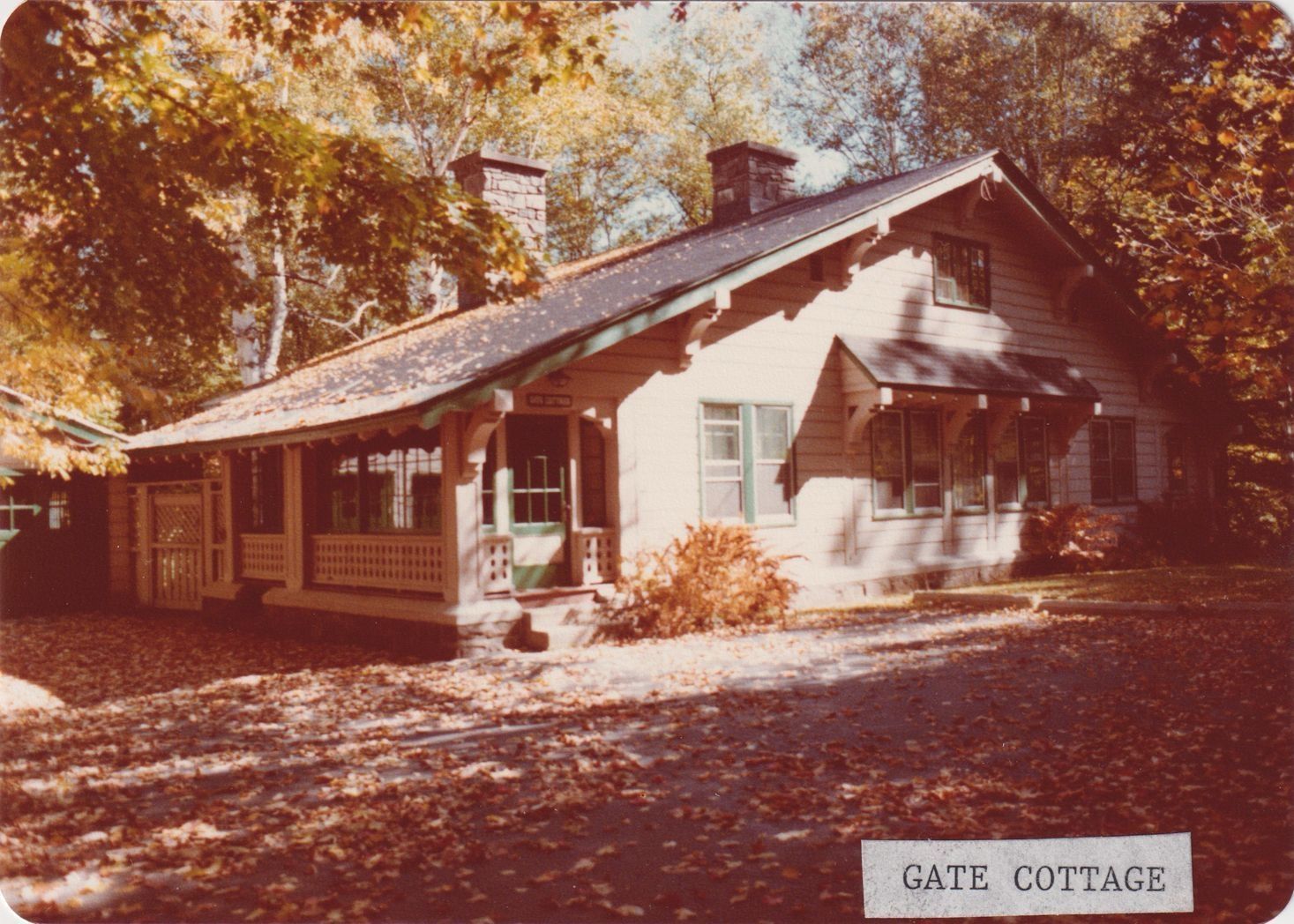 Color photograph of the Superintendent's Cottage at Trudeau Sanatorium, taken when the grounds were owned and used by the American Management Association. There is a label affixed to the front of the photograph that has "Gate Cottage" typewritten on it.