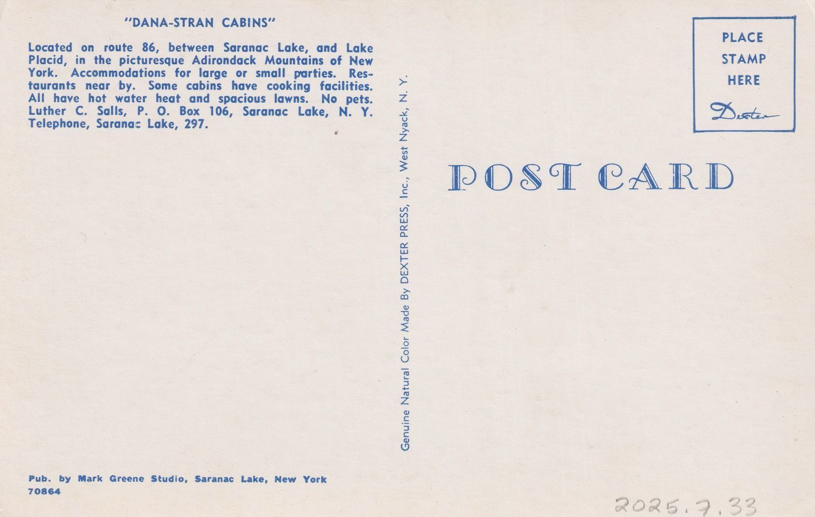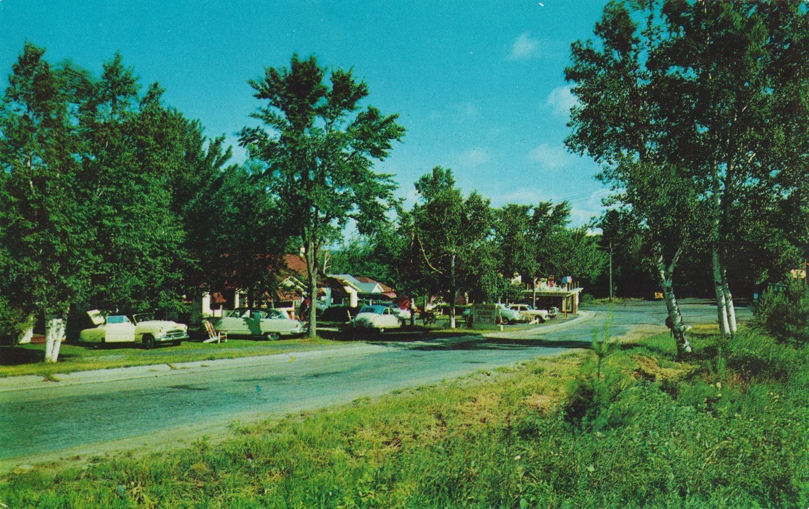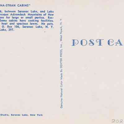Color postcard showing cars parked along a road in front of small cabins. Printed caption on reverse reads, "Dana-Stran Cabins." Printed by Mark Greene Studio, Saranac Lake, NY. Unused, divided back.Subject Place