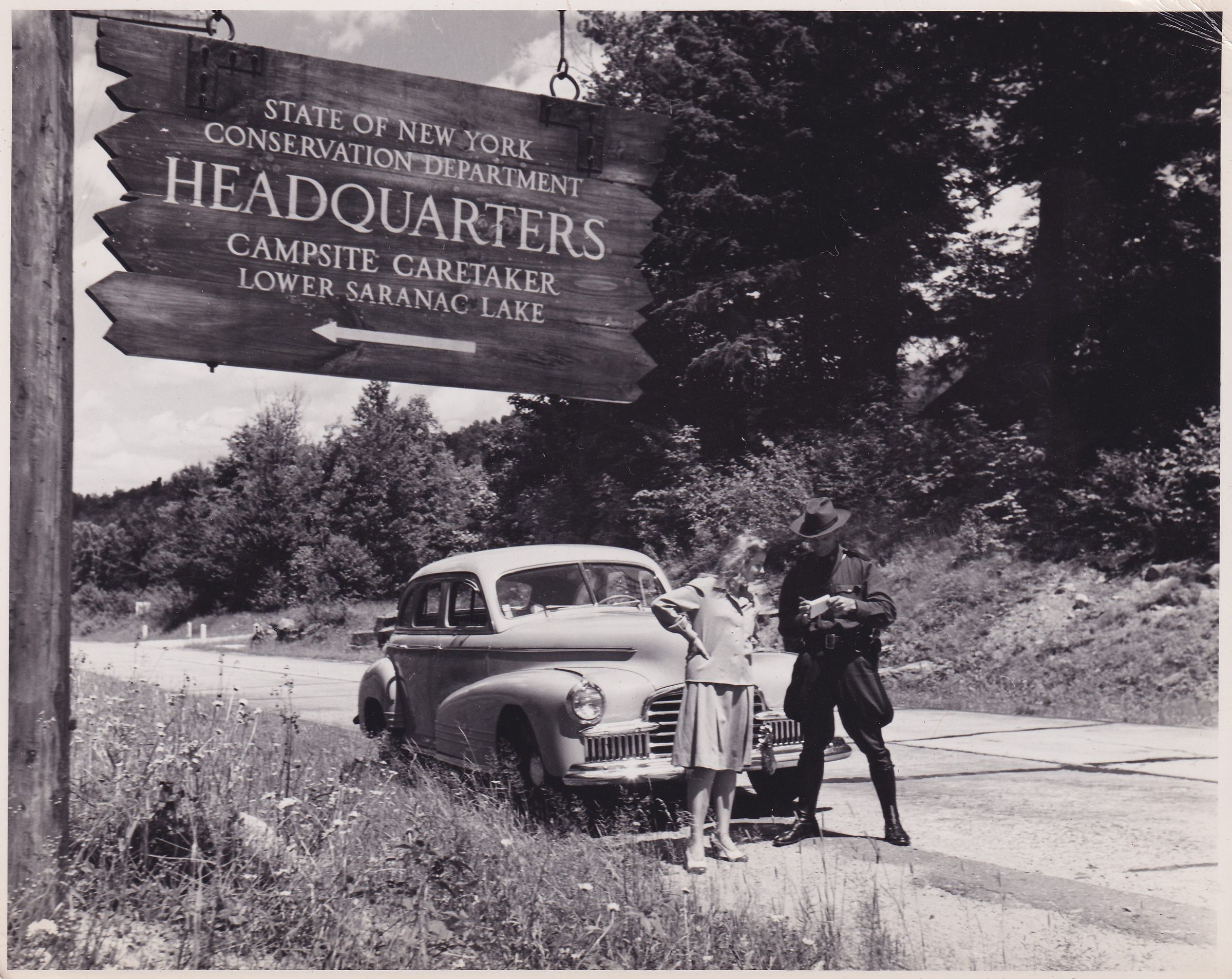 Black-and-White photograph of a man in a game warden uniform writing a note or a ticket while a woman looks on. A car is parked on the side of the road behind them. There is a sign for the State of New York Conservation Department Headquarters, Campsite Caretaker, Lower Saranac Lake, hanging at the left side of the photograph.Made/Created