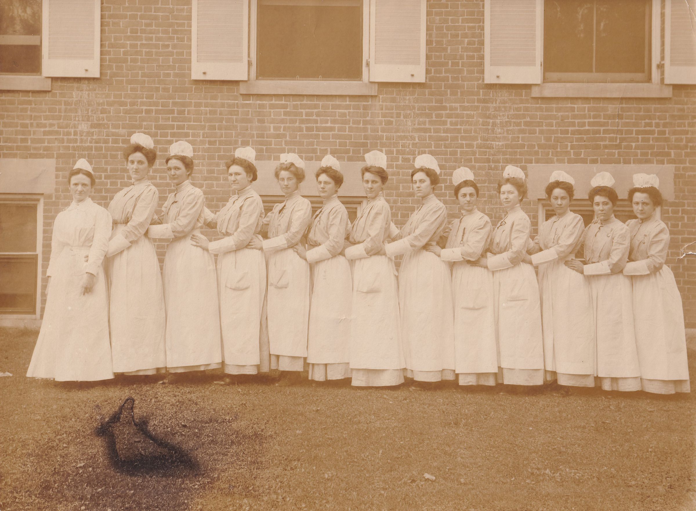 Photograph of 13 nurses in striped uniform dresses and white caps standing in front of an unidentified brick building. The women are standing in a row, with their bodies facing left. They have their faces turned toward the camera. Each woman has her left hand on the waist of the woman in front of her, and her right on her back or shoulder. Blanche Smith is standing sixth from the left. The first woman in the row is older and wearing a different style uniform.