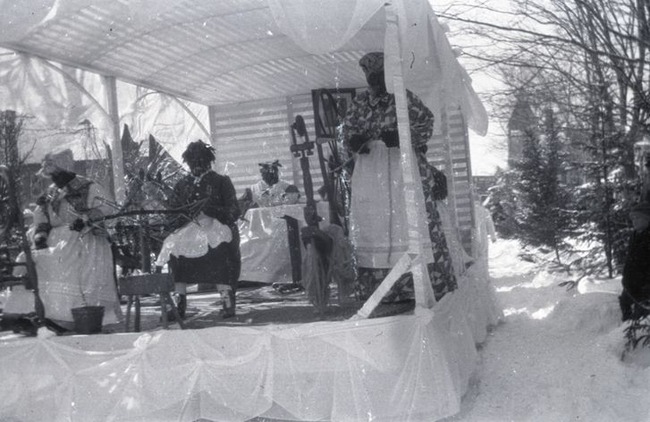 Please note: Historic Saranac Lake acknowledges that historical records may contain harmful language or imagery that reflects attitudes and biases of their time. HSL does not alter, edit, or modify original records or original captions, as they are part of the historical record. Negative of a Winter Carnival float with at least four unidentified individuals in Blackface, dressed as Black women. Most likely taken by Mary Ives Baldwin. This item is not fully cataloged but has been uploaded so the image is publicly available; if you would like us to prioritize cataloging this item, please contact the HSL Collections team.