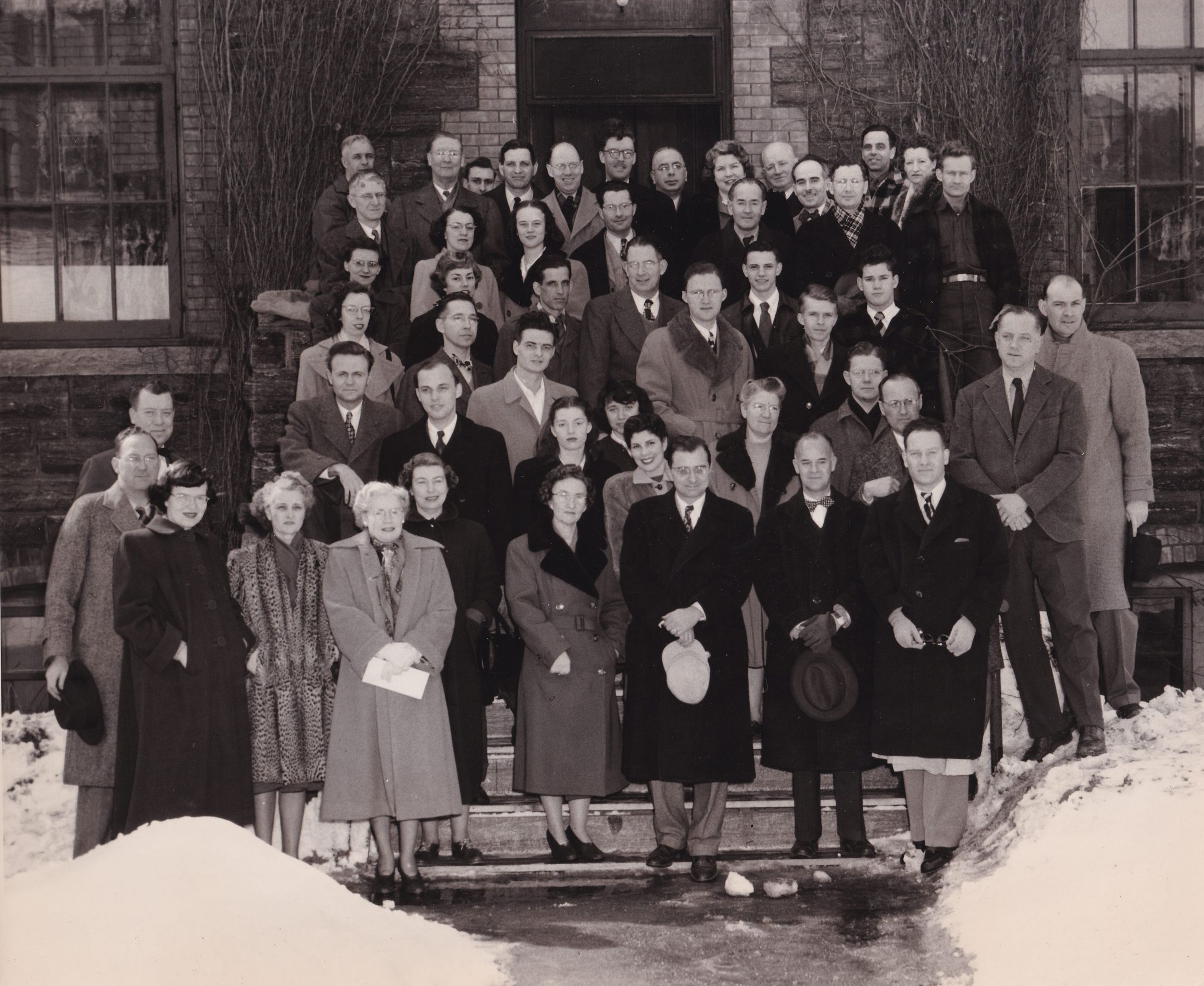 Black-and-White photograph of a group of unidentified people on the steps of the Saranac Laboratory in winter. John Schmidt is in the back row, 5th from right, wearing a bow tie. Robert Liddy is standing at far right on a snowbank, wearing a light colored coat. These may be participants in the Trudeau School of Tuberculosis and/or employees of the Saranac Laboratory.