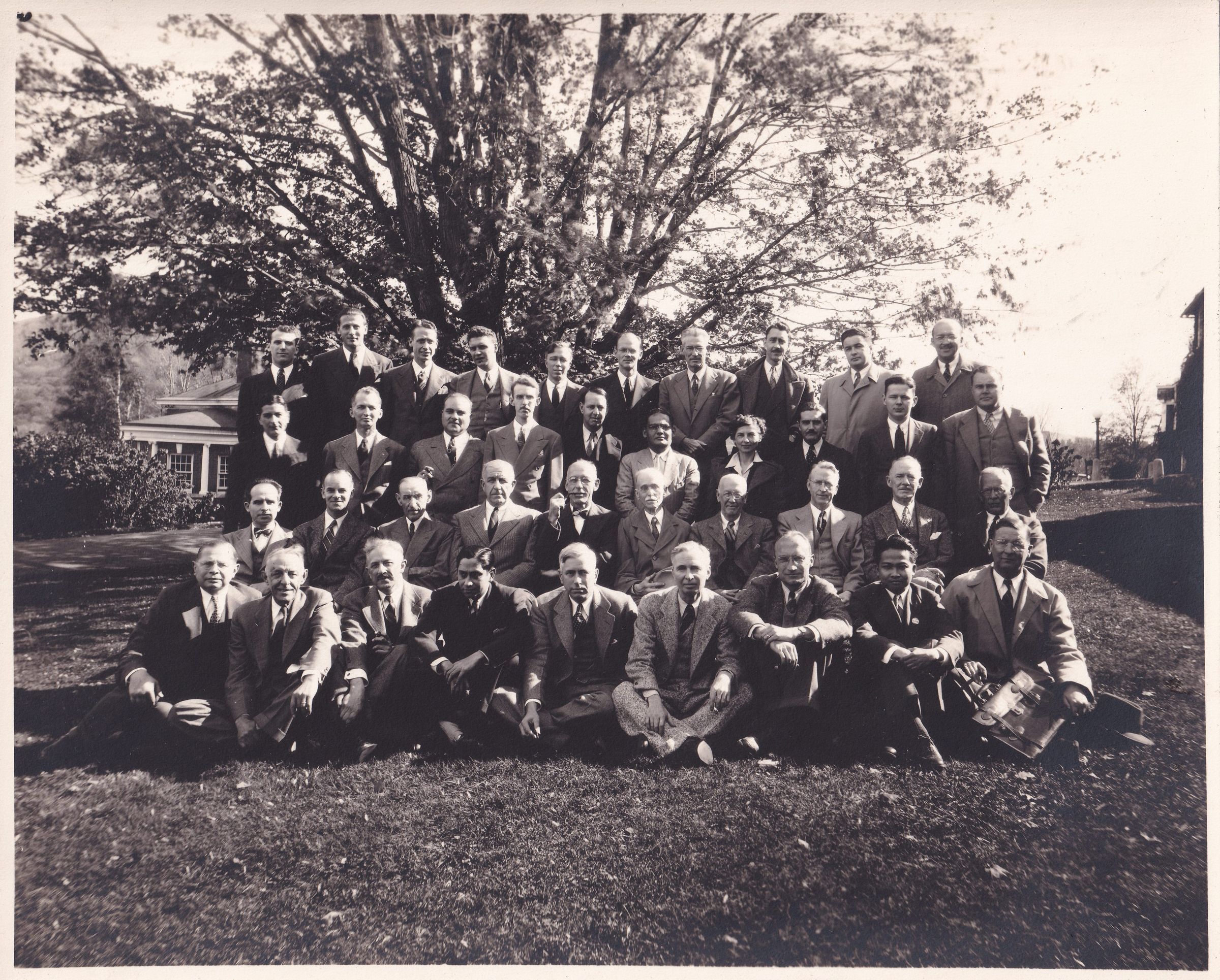 Photograph of a group of doctors and scientists at Trudeau Sanatorium. They are seated on the ground in front of the Main Building. Dr. John Schmidt is seated first at left, Dr. Francis Berger Trudeau is seated fourth from left, and Dr. Edward R. Baldwin is seated sixth from left in the second row. All the rest are unidentified.