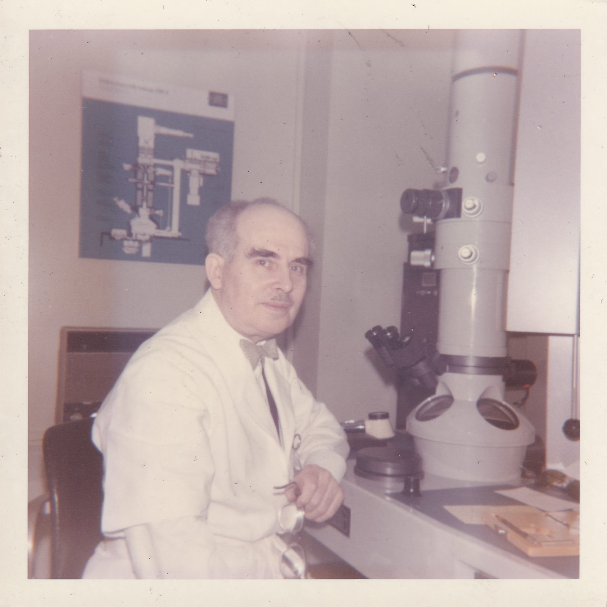 Color photograph of Dr. John Schmidt with a new ZEISS electron microscope at Trudeau Institute Research Laboratory.