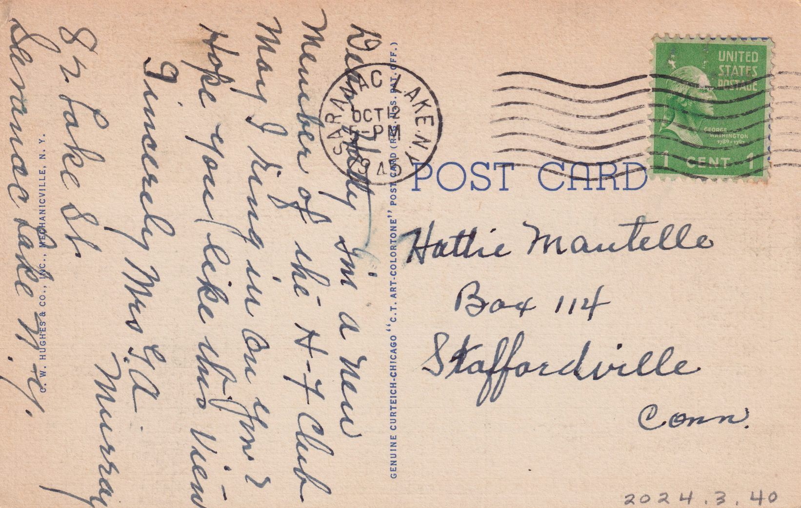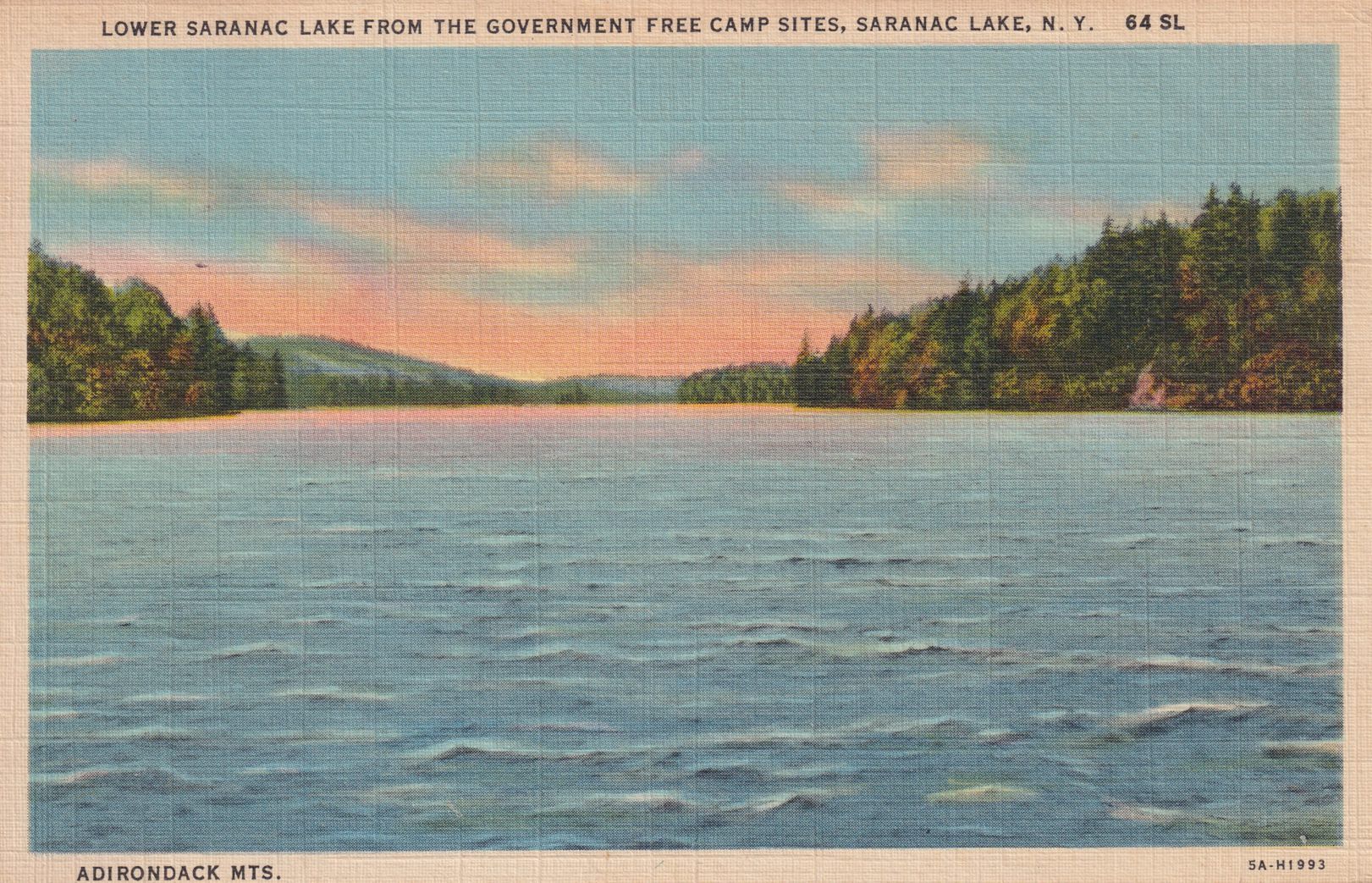 Color postcard showing a lake lined by trees. Printed caption on front reads, "Lower Saranac Lake from the Government Free Camp Sites, Saranac Lake, N.Y." Printed by C. W. Hughes & Co., Inc., Mechanicville, NY. Used, divided back, white border, postmarked Saranac Lake, October 12, 1945. Handwritten message on back reads, "Dear Hatty, I'm a new member of the H-7 Club. My I ring in on you? I hope you like this view. Sincerely, Mrs. G. A. Murray. 82 Lake Street, Saranac Lake, N.Y."Subject Place