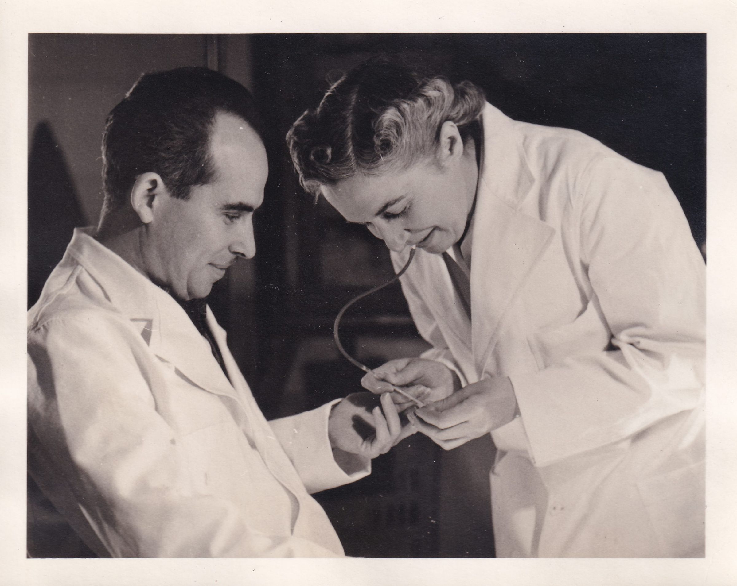 Black-and-White photograph of Dr. John Schmidt with Helen Cooke, in the Laboratory at Trudeau Sanatorium. Cooke appears to be taking a blood sample from Schmidt’s finger.