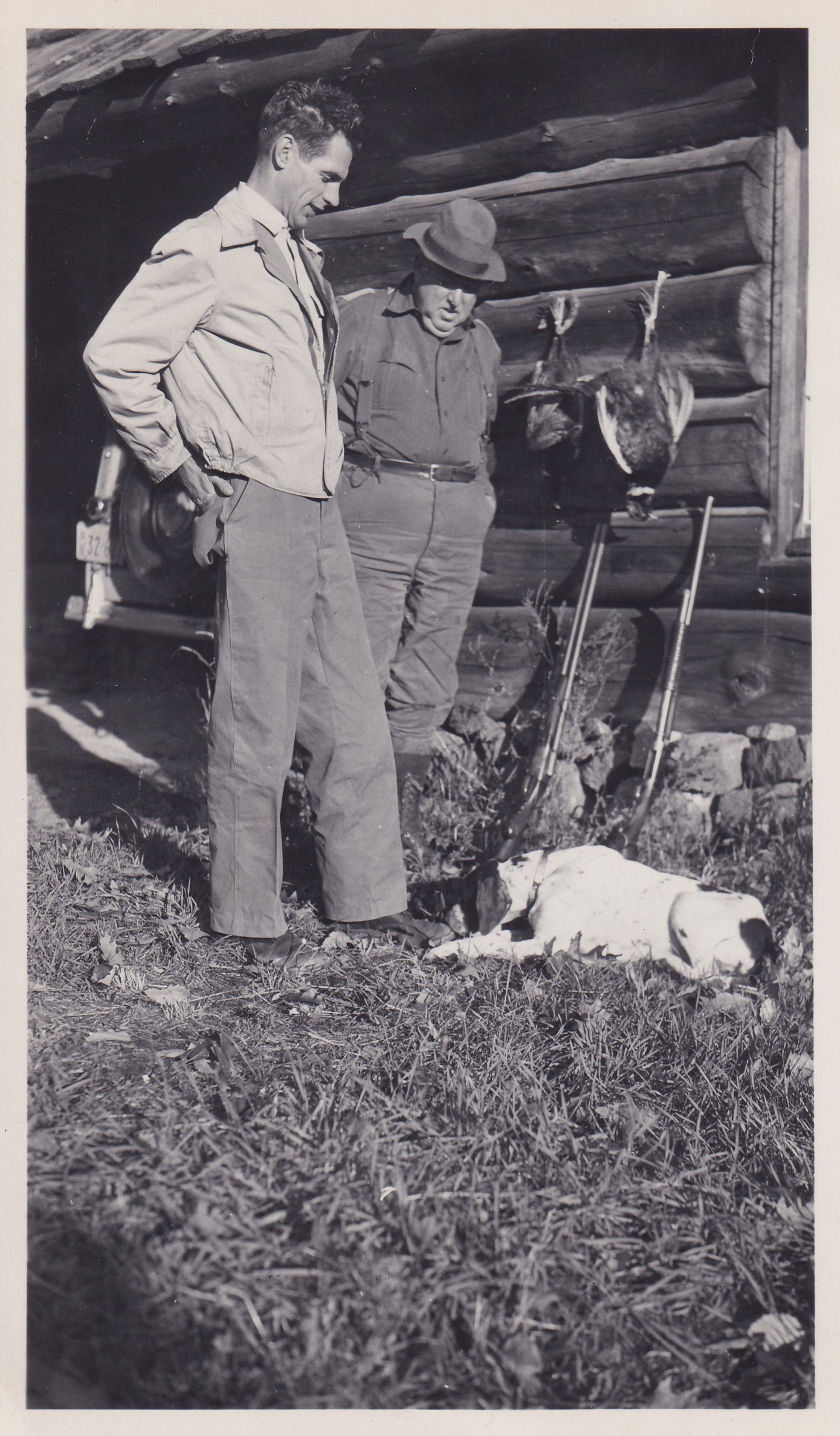 Black-and-White photograph of two men standing next to a log cabin, looking down at a hunting dog. Ray Burmaster is at right. There are two game birds hanging on the building and two rifles underneath them.