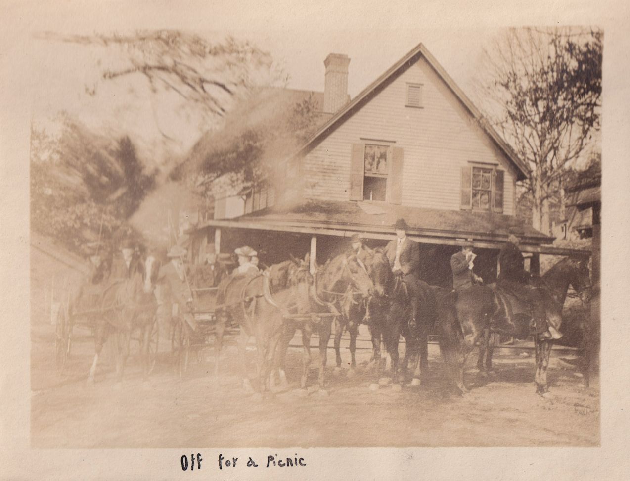 Black-and-white photograph of four men on horses and other people in two horse-drawn buggies. The group is in front of a house with a large first floor porch. "Off for a Picnic" is written in ink beneath the photograph.