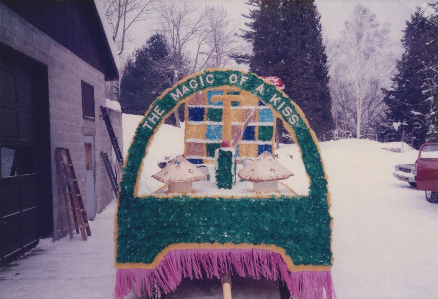 Color photograph of a Winter Carnival float with an arch that reads "The Magic of a Kiss." The visible side of the float is green, and two mushrooms can be seen underneath the arch. This photograph is from an album of photographs taken by staff of the American Management Association.