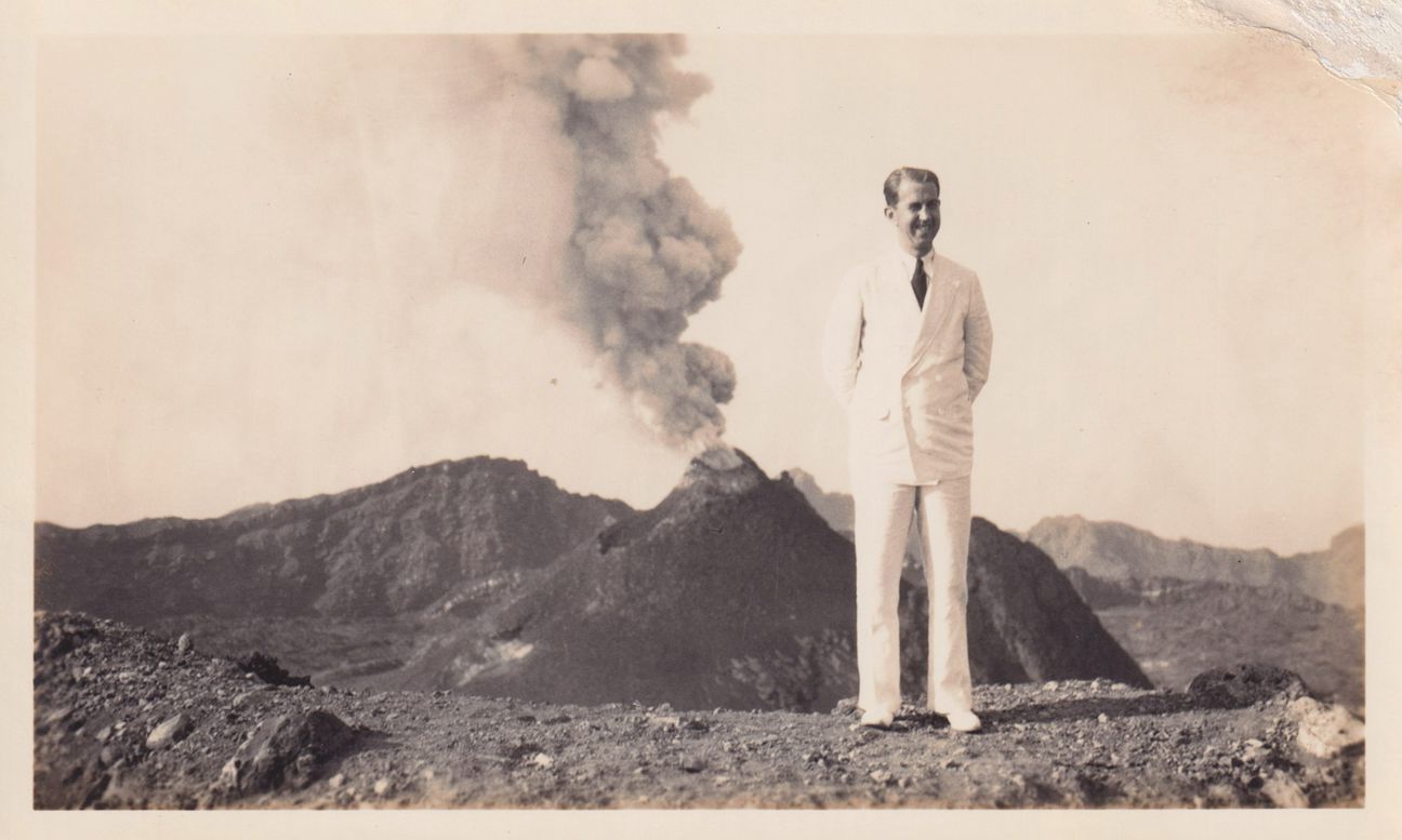Black-and-White photograph of a man in a white suit, standing in front of a volcano crater. Smoke can be seen coming from the volcano. The photograph was likely taken by a person on vacation in Italy and printed by Kollecker's Kodak and Gift Shop.