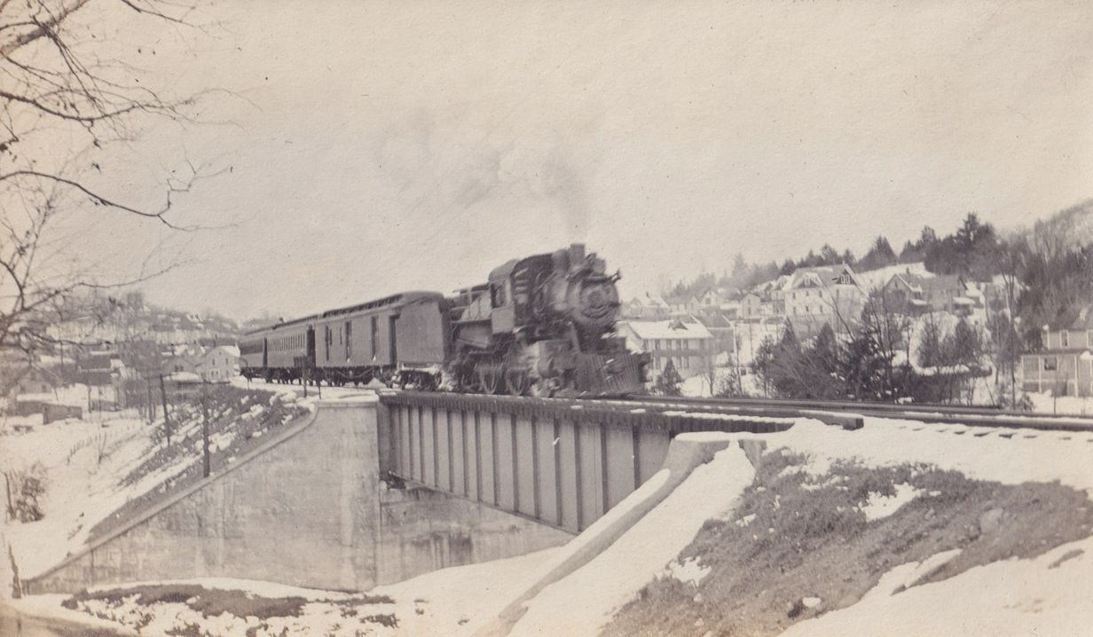 Black-and-white photograph of a steam engine train crossing a small bridge. There is snow on the ground around the train tracks. There are multiple houses visible behind the train.