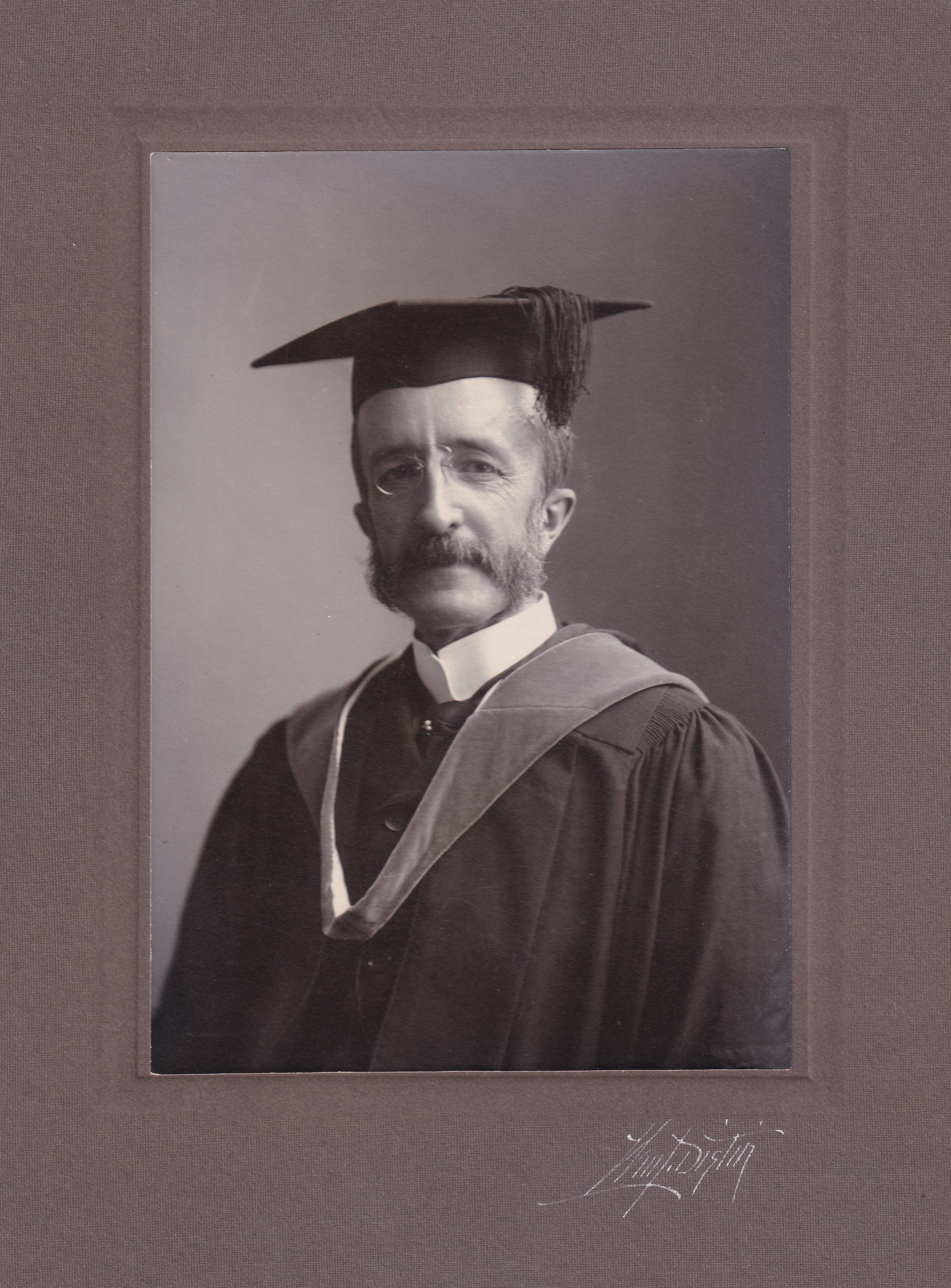Black-and-White studio portrait photograph of Dr. Edward Livingston Trudeau in academic robes and cap after receiving an honorary degree. Portrait by William L. Distin, mounted on gray cardboard backing.