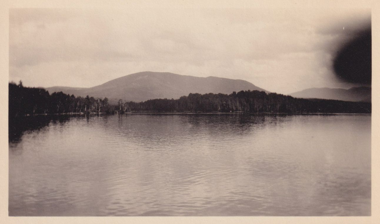 Black-and-White photograph of an unidentified body of water. Mountains can be seen in the distance. the photograph was likely printed by Kollecker's Kodak and Gift Shop.