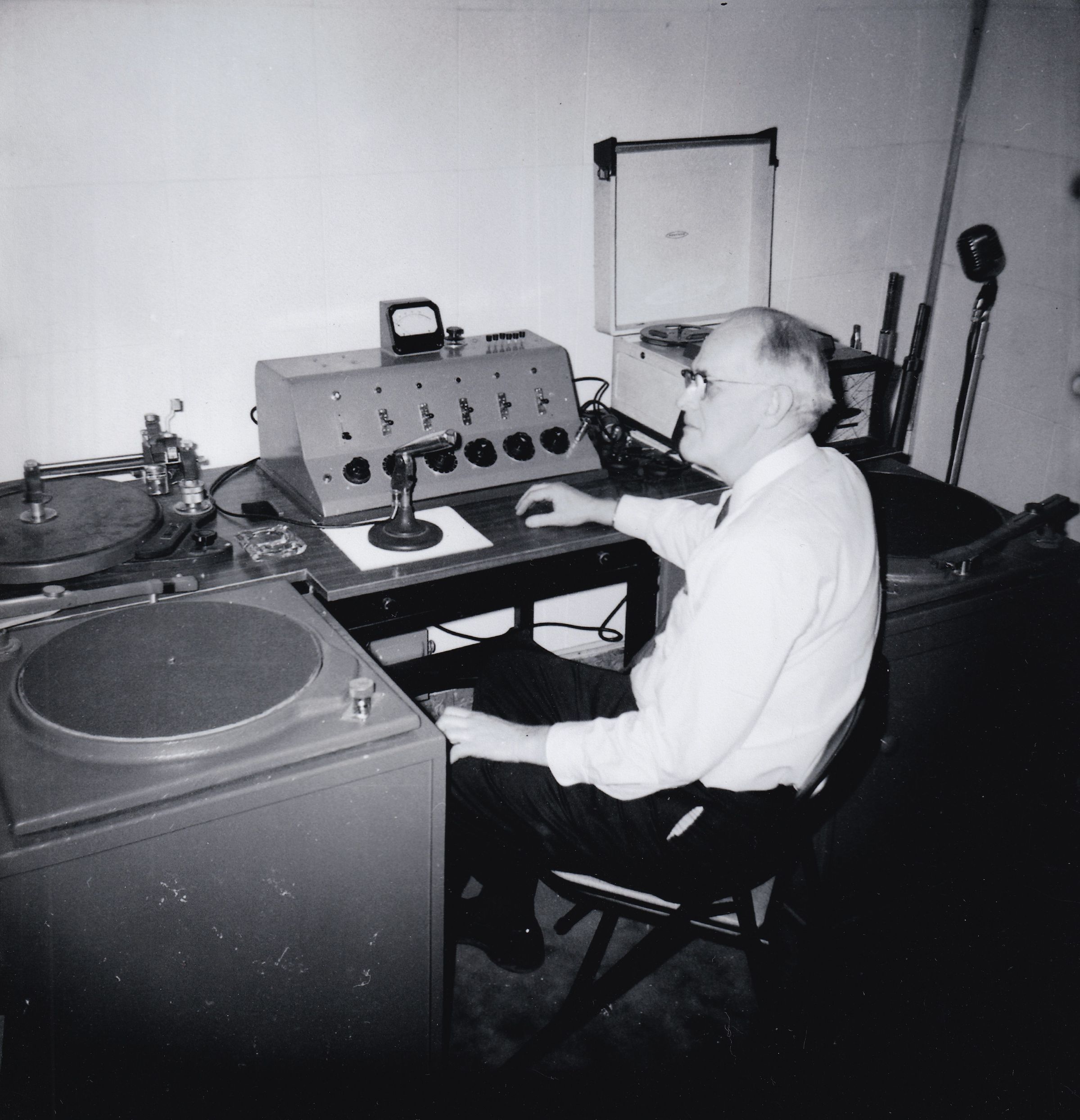 Black-and-White photograph of "Joe" H. Berwind Williams, engineer, in the back studio at WNBZ, c. 1963. The station was located in the Berkeley House at the time.