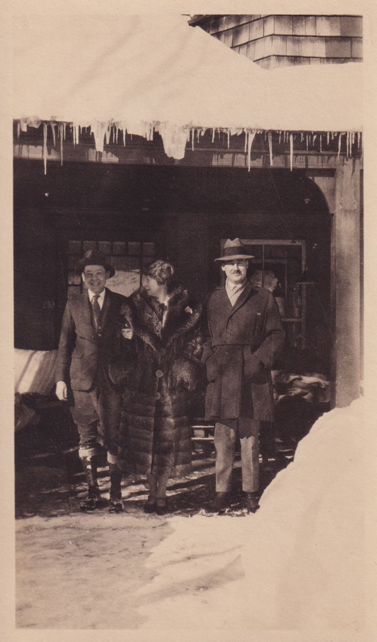 Black and white photograph of two men and one woman standing together in front of a wooden building. There are large snow drifts in front of the building.