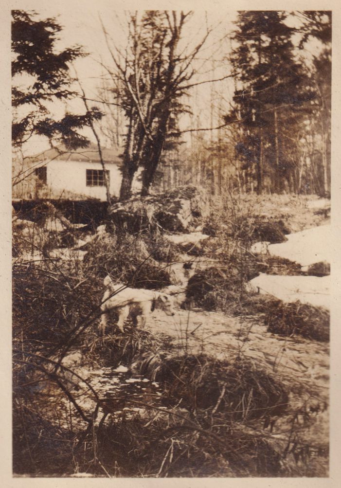 Black-and-White photograph of Peggy, the Jones' dog, wandering through melting snow by a brook. Part of album 2024.21.1, kept by Amy Jones and David Blair Jones c. 1930-1934.