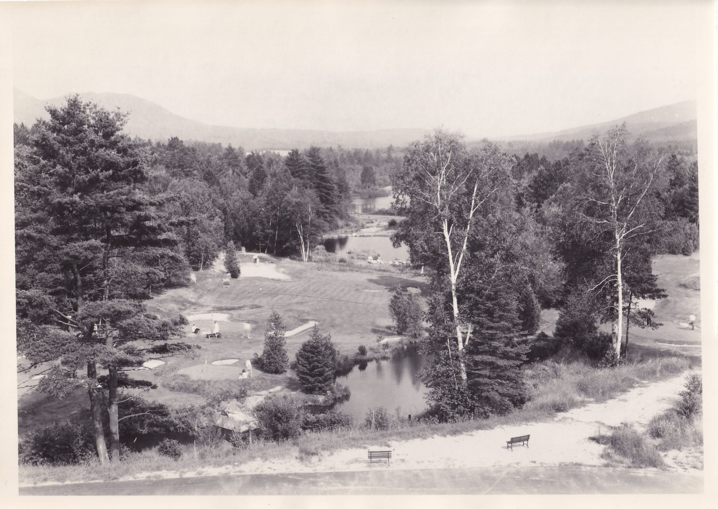 Photograph of the golf course at the New York State Hospital for Incipient Tuberculosis, AKA Ray Brook Sanatorium. The photograph was taken from a slightly elevated perspective, and people can be seen playing golf. Handwritten note on back reads, "the Golf Course at Raybrook."