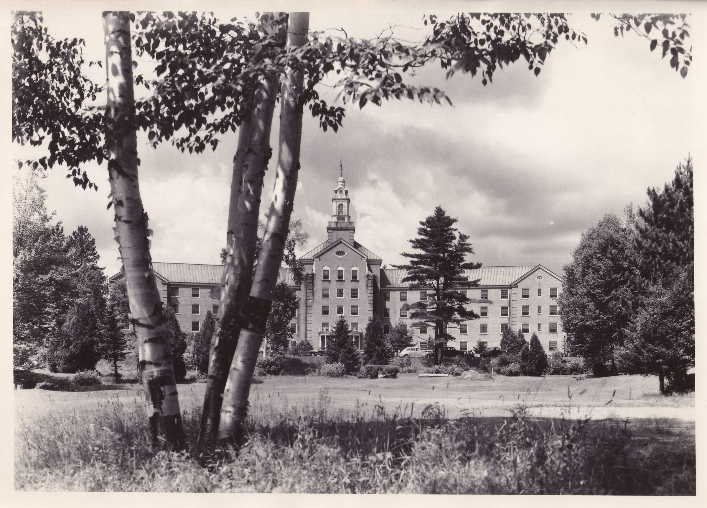 Black-and-White photograph of the Infirmary/Surgical/New Building at the New York State Hospital for Incipient Tuberculosis, AKA Ray Brook Sanatorium.The photograph was taken looking across the lawn, and there are cars parked out front.