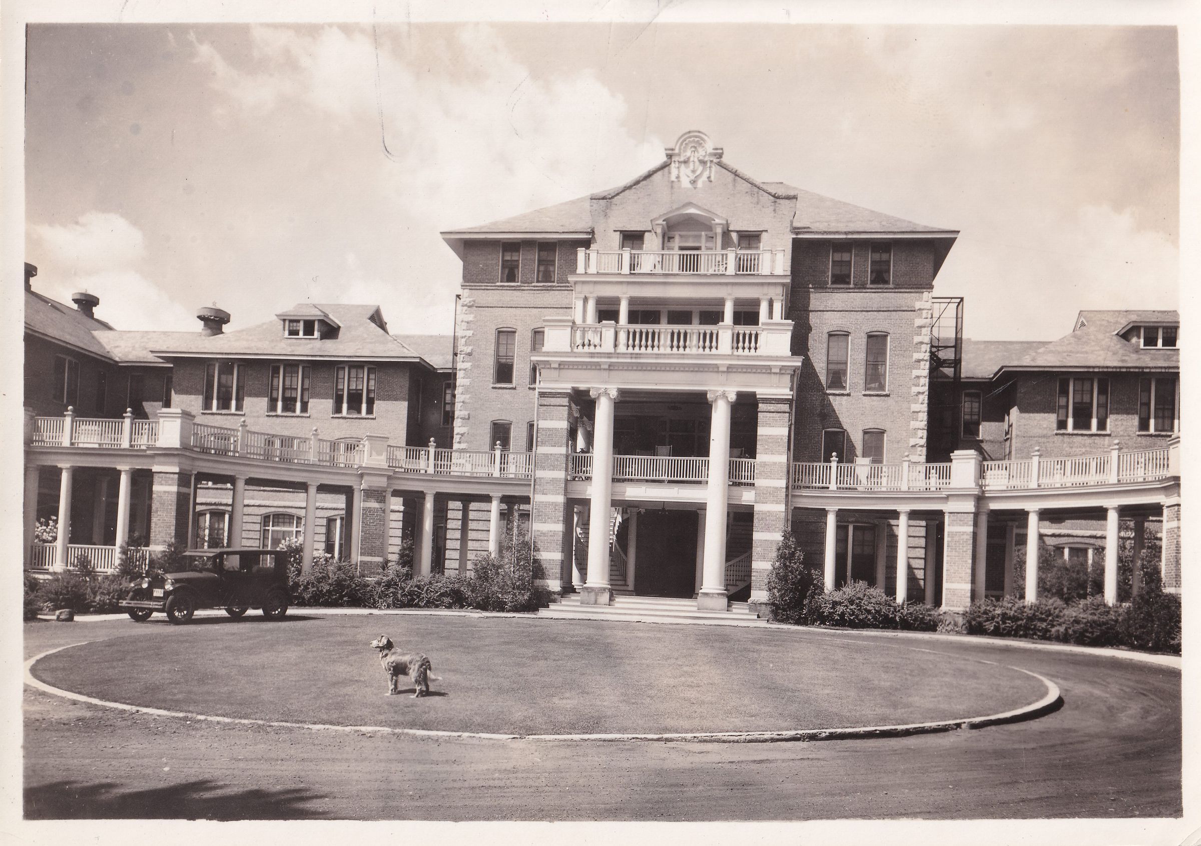 Black-and-White photograph of the Main/Administration/Old Building at the New York State Hospital for Incipient Tuberculosis, AKA Ray Brook Sanatorium. The circular driveway in front of the building is visible, and there is a car parked in at the west side of the driveway. There is a dog standing on the lawn.