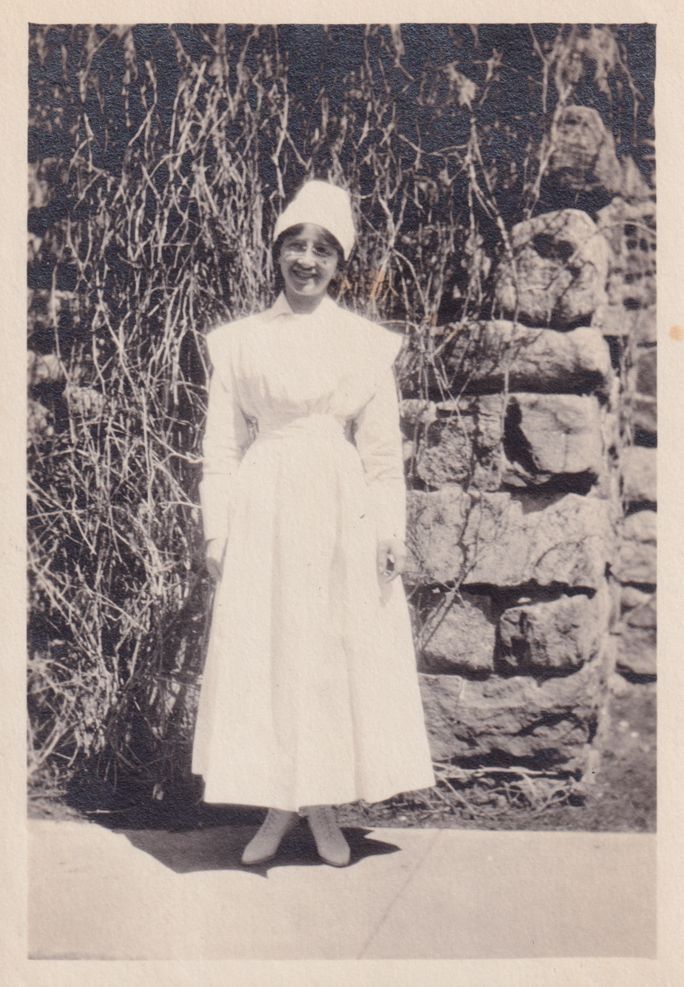 Black and white photograph of a nurse standing in front of a stone wall with vines hanging down the side.