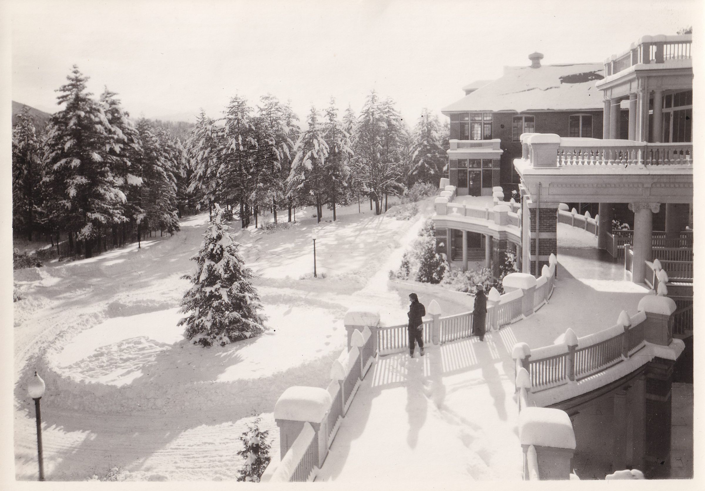 Black-and-White photograph of the New York State Hospital for Incipient Tuberculosis, AKA Ray Brook Sanatorium in the snow. The photograph was likely taken from the upper porch on the East Wing, looking southwest across the curved porch in front of the Main Building. Two people are standing at the porch railing looking out at the snow. There is a large evergreen tree inside the circular lawn in front of the building. Handwritten note on the back reads, "N. Y. S. Hospital for Incipient Tuberculosis, Ray Brook, N. Y."Photograph Details