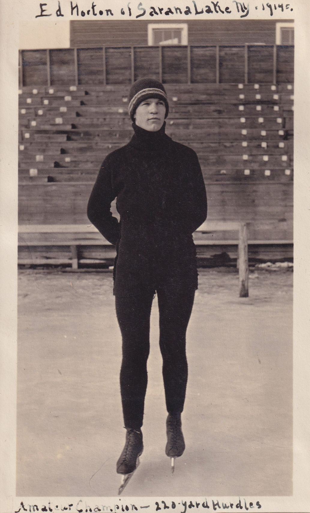 Black-and-white photograph of Edmund Horton in skating gear, standing on the ice in front of an empty set of stands. "Ed Horton of Sarana Lake NY 1914" is written at the top of the photograph, with "Amateur Champion -- 220 yard hurdles" at the bottom.