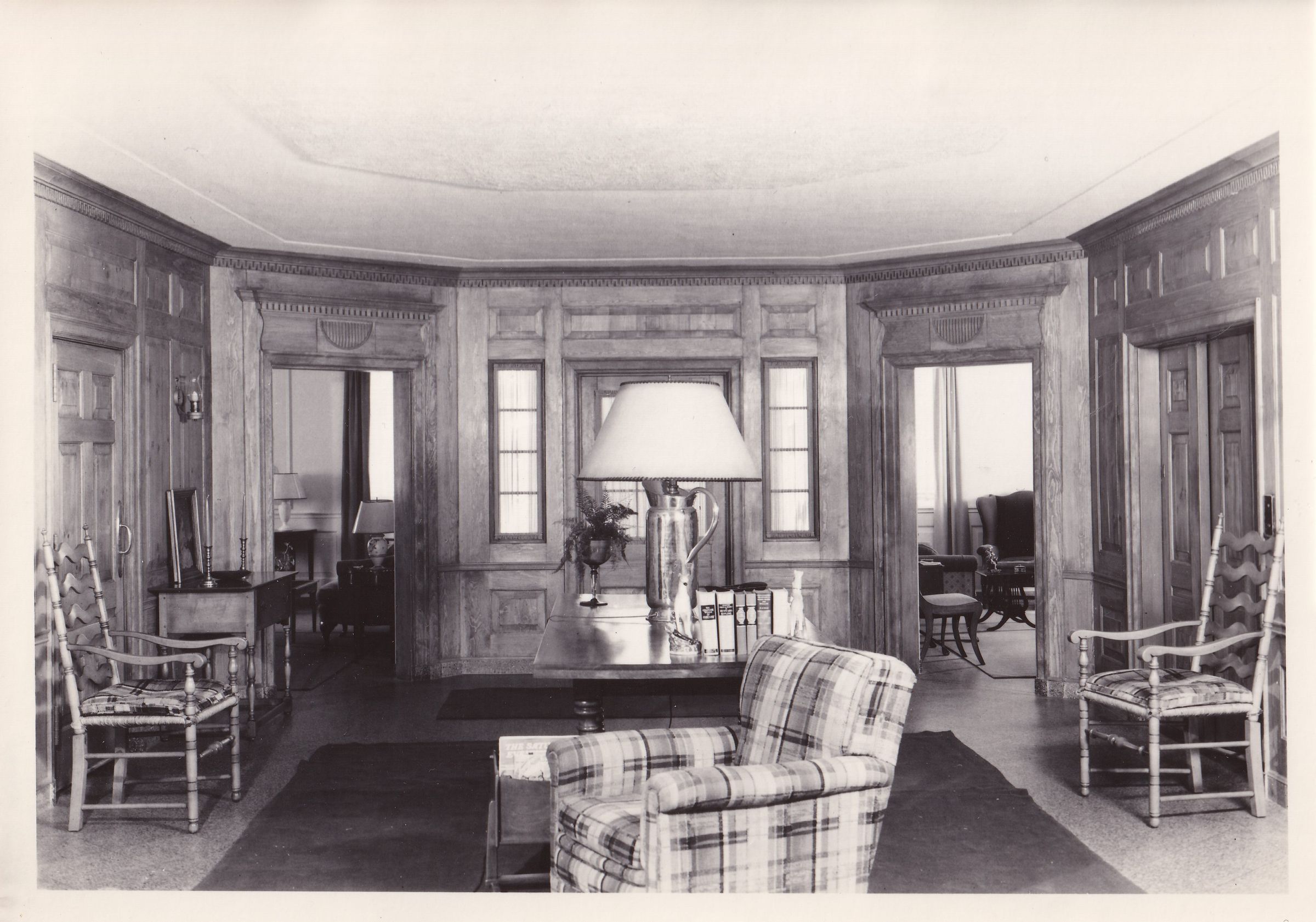 Photograph of the lobby of the Infirmary/Surgical/New Building at the New York State Hospital for Incipient Tuberculosis, AKA Ray Brook Sanatorium. The room has all-over wood paneling, and is full of tables and chairs. There are doors around the room and the two at the back are open into the next room. There is an elevator at the far right with wooden doors. Handwritten note on the back reads, "Ray Brook, Surgical Building Lobby. Built 1939."