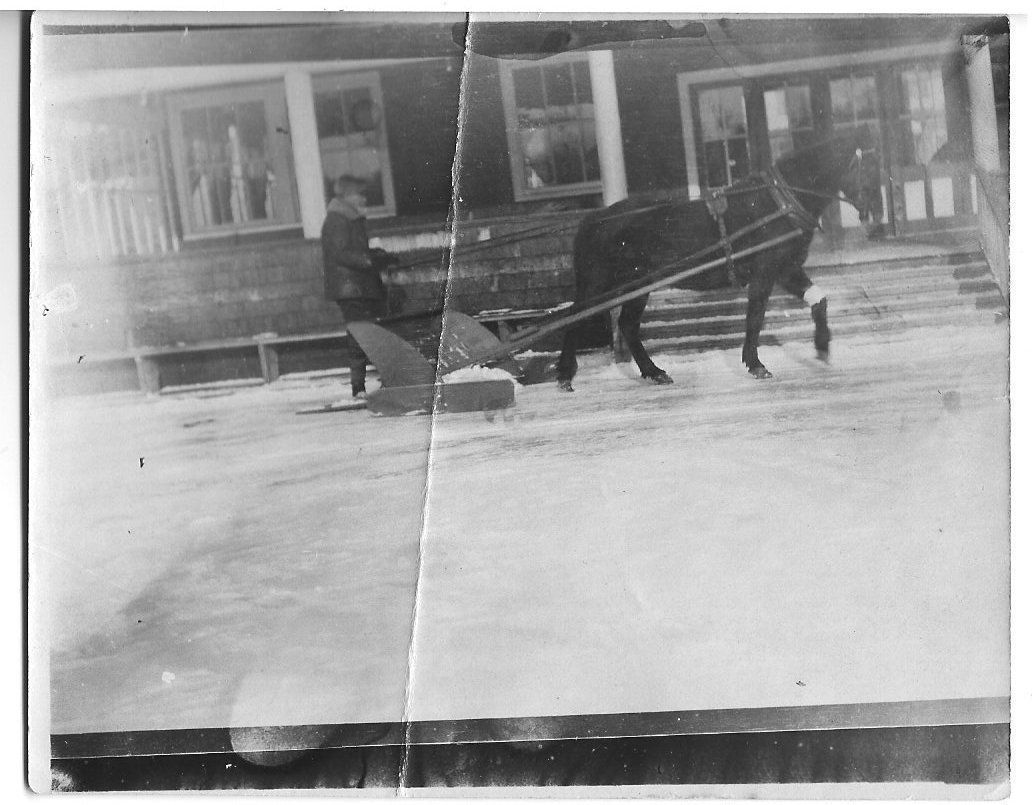 Black and White photo of Horse "Zamboni" Handwritten note on reverse: "Cleaning rink at the old Curling Club which is now Madden's store house on Lk Flower Ave"