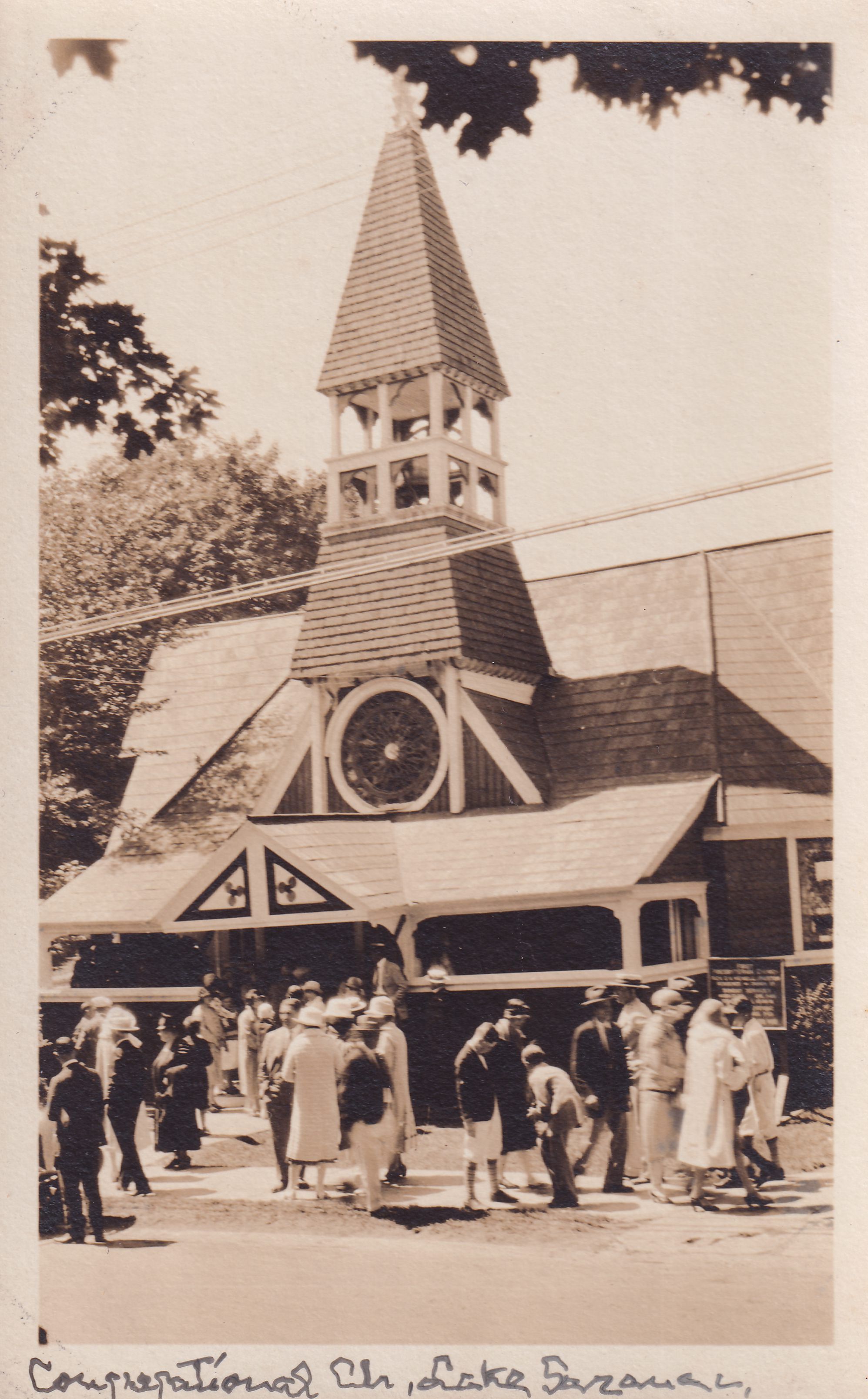 Photograph postcard showing groups of people standing outside of the First Presbyterian Church of Saranac Lake. [This photograph looks similar to ones from President and Mrs. Coolidge's visit to the church, so it may be from that same morning.] Handwritten caption on front reads, "Congregational Ch, Lake Saranac." No photographer's mark. Unused, divided back, white border.Subject Person/Organization
