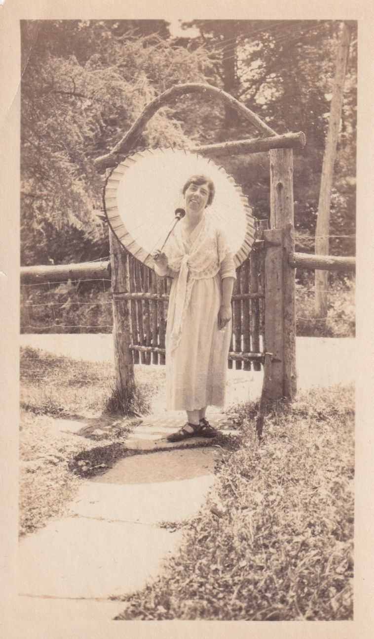 Black-and-White photograph of a woman standing in front of a wooden gate. She is holding a parasol over her shoulder. The photograph was likely printed by Kollecker's Kodak and Gift Shop.