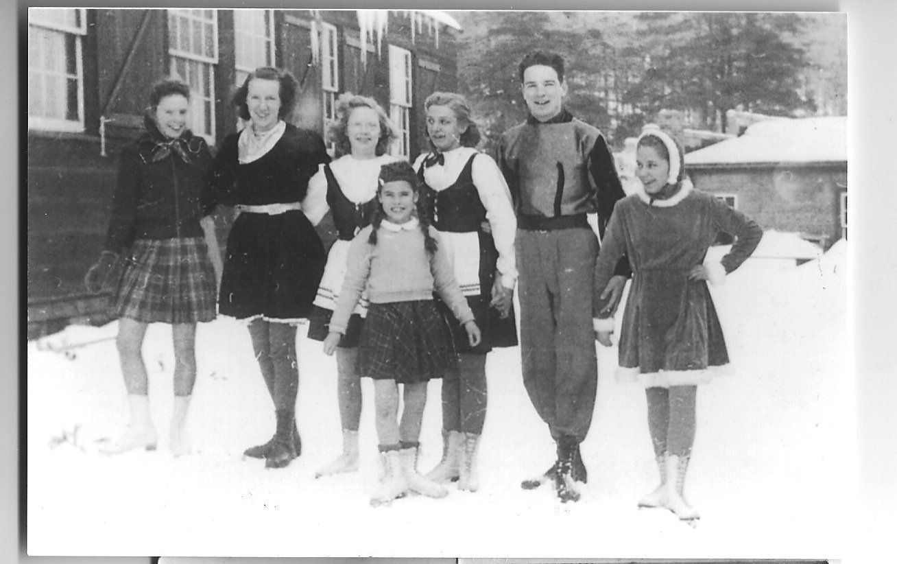 Black and White Photo of Skaters Left to Right: Bernadette Harrigan, Alice Walsh, Phyllis Harton, John Walsh, Ruth Lamy and Natalie Bombard (later Leduc)-Front row Curling Club-River St