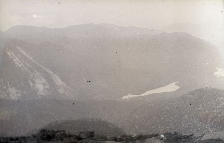 Negative of a mountain view. There is snow on some parts of a mountain in the distance. Most likely taken by Mary Ives Baldwin. This item is not fully cataloged but has been uploaded so the image is publicly available; if you would like us to prioritize cataloging this item, please contact the HSL Collections team.